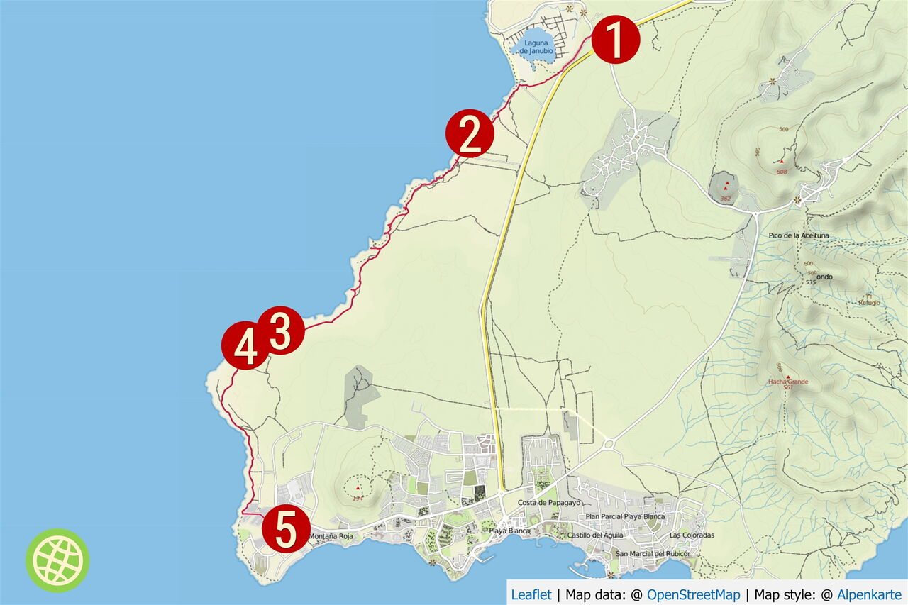 Ab und zu markieren rostige Pfeiler den Weg. Hinter der Punta Guinéa dreht die Richtung des Weges auf Süd. Links liegt nun der Hausvulkan von Playa Blanca, der Montaña Roja, und am Horizont lassen sich bereits der Leuchtturm sowie die vorgelagerten Apartmentanlagen ausmachen. Nach einem Graben gehen wir direkt auf die ersten Häuser zu, um noch weitere 200 m auf der Strandpromenade zu spazieren. Dann biegen wir bei einem Grünstreifen links in die nur kurz später beginnende Calle Irlanda ab, gehen vorbei an einigen Läden und erreichen die (05) Bushaltestelle Faro Park (19 m).