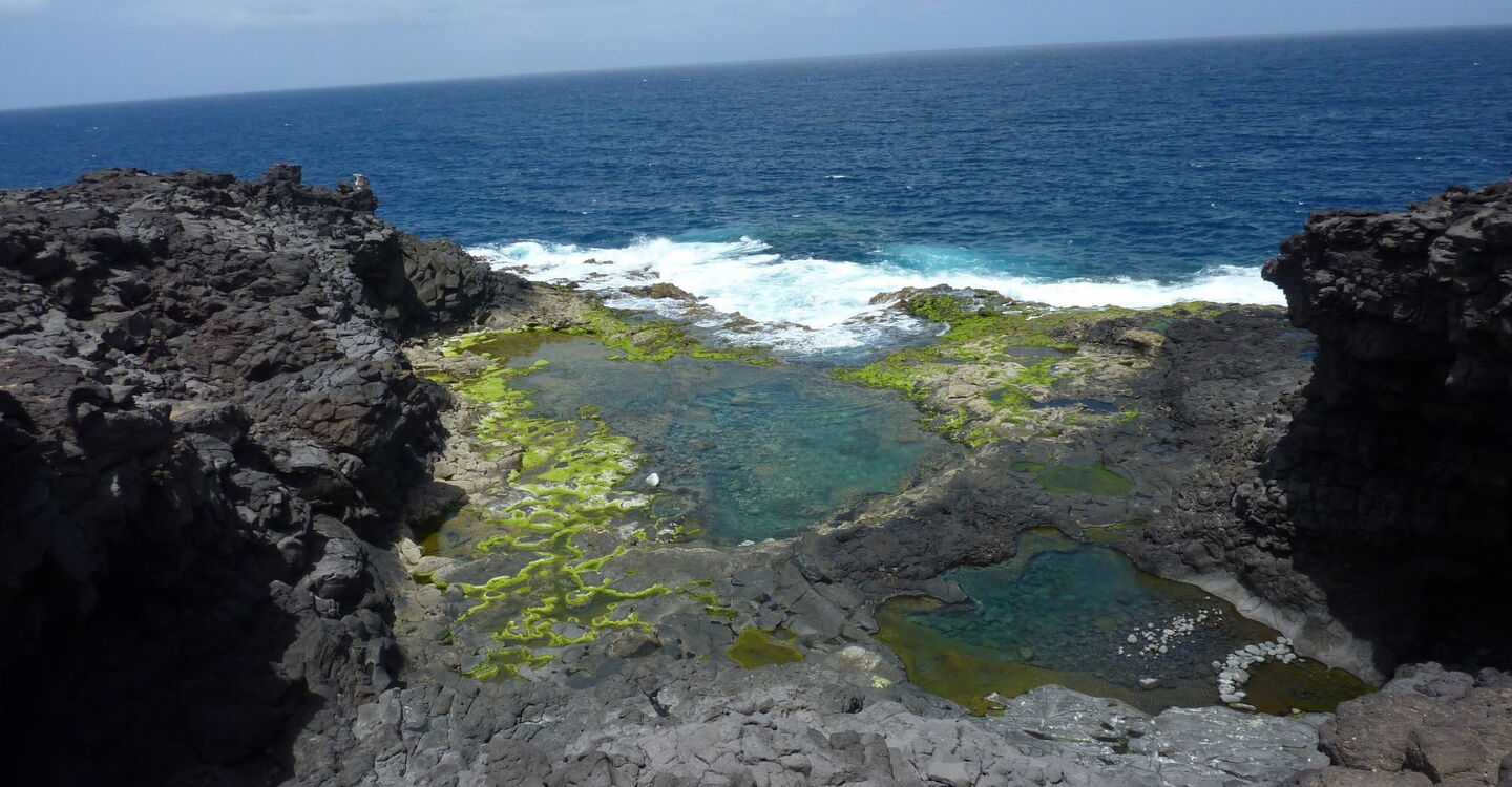 Wir gehen durch den Haupteingang der Bauruine bis zum Meer vor. Schauen wir über die Klippe, so sehen wir wundervolle versteckte Badeplätze. Diese sogenannten Charcos - (04) Naturschwimmbecken (26 m) - laden zum Baden an der felsigen Küste ein. Bei Flut oder bei rauer See füllen sich die von der Natur geschaffenen Pools mit Meerwasser, das sich in der Sonne erwärmt. Im weiteren Verlauf Richtung Playa Blanca treffen wir noch auf weitere Pools. Baden kann man hier aber nur bei Ebbe und geringem Wellengang, ansonsten besteht Lebensgefahr aufgrund des starken Wellengangs und der starken Unterströmungen.