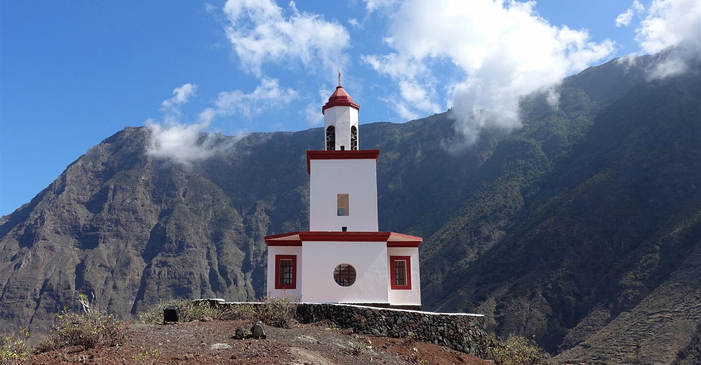 Hinter den Palmen gehen wir halb links in die Einbahnstraße und dann am Hotel Ida Ines vorbei, bis die Straße endet. Gegenüber von der Policia Local gehen wir links, überqueren nach 100 m die Straße und steigen über den halbhohen Zaun, um auf dem vor uns liegenden Bergrücken bis zur (05) Ermita de la Candelaria (378 m) aufzusteigen. Nachdem wir die atemberaubende Aussicht über das Halbrund des El-Golfo-Tals genossen haben, gehen wir zum kleinen Dorfplatz herunter. Ein ausgeschilderter Wanderpfad führt von dort Richtung Lagarto Gigante. Nun führt der gepflasterte Pfad durch das Dorf Las Lapas wieder bergab. Es geht entlang von Obstbäumen, Ananasplantagen und Weinfeldern bis zur Verbindungsstraße von Frontera nach Valverde. Ein lohnenswerter Abstecher: Geht man 200 m rechts auf der Straße Richtung Valverde, so gelangt man zur Auffangstation der Rieseneidechsen. Wir überqueren aber bei dem Stoppschild die Straße und gehen geradeaus weiter, bis die Straße endet. Wir gehen anschließend links weiter, um dann bereits nach 100 m rechts zu gehen – Palmen säumen die Straße. Wir überqueren die nachfolgende Kreuzung und gehen zunächst Richtung La Maceta, biegen aber nach 275 m, vor der hohen Trockensteinmauer, nach halb rechts ab. Die Piste endet direkt an der Steilküste und nach einigen Metern links erreichen wir den Parkplatz beim Ausgangspunkt.