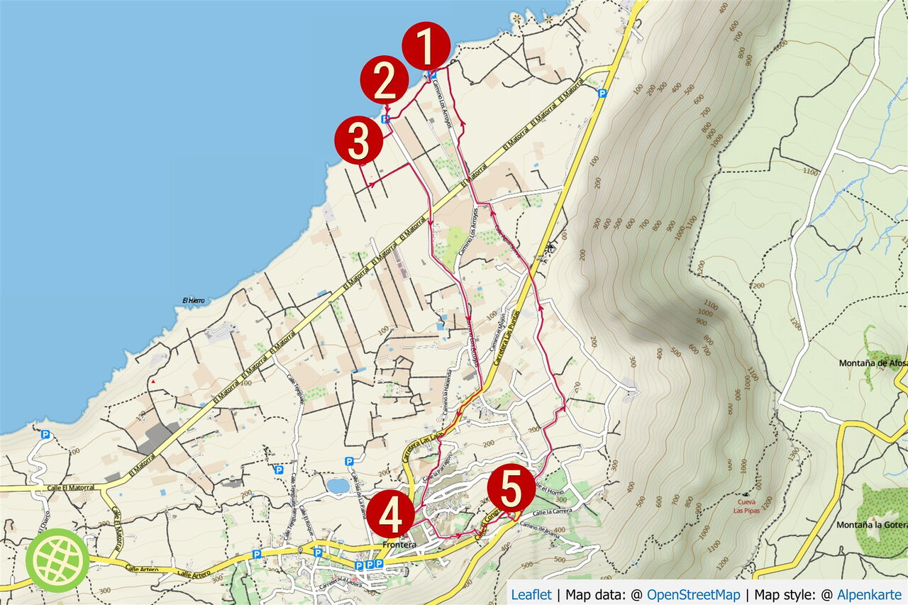 Wir überqueren die HI-550 und folgen der Ausschilderung Richtung Los Mocanes, wo wir nach 1,5 km auf die Verbindungsstraße von Valverde treffen und dieser Richtung Frontera folgen. Vor dem zweiten Palmenhain biegen wir links in die Einbahnstraße. Diese verläuft 90 m parallel zur Hauptstraße und mündet dann in eine weitere Straße. Dort gehen wir weitere 50 m links, um dann rechts hinter dem Haus auf den beginnenden Camino abzuzweigen. Den folgenden halbrechten Abzweiger durch das Gatter ignorieren wir. Auf dem teilweise stark verwachsenen Camino erreichen wir eine geteerte Straße und queren diese, bis sie nach 225 m vor einem roten Haus endet. Wir gehen rechts bis zur Hauptstraße vor und dann links auf der mit Birkenfeigen gesäumten Straße bis zum zentralen Busbahnhof von (04) Frontera (247 m). An der Kreuzung auf Höhe des Busbahnhofs gehen wir scharf links und folgen der Ausschilderung Centro Cultural. Nach 240 m, bei dem Stoppschild, gehen wir rechts, vorbei an den Apartmentos Los Verdoes.