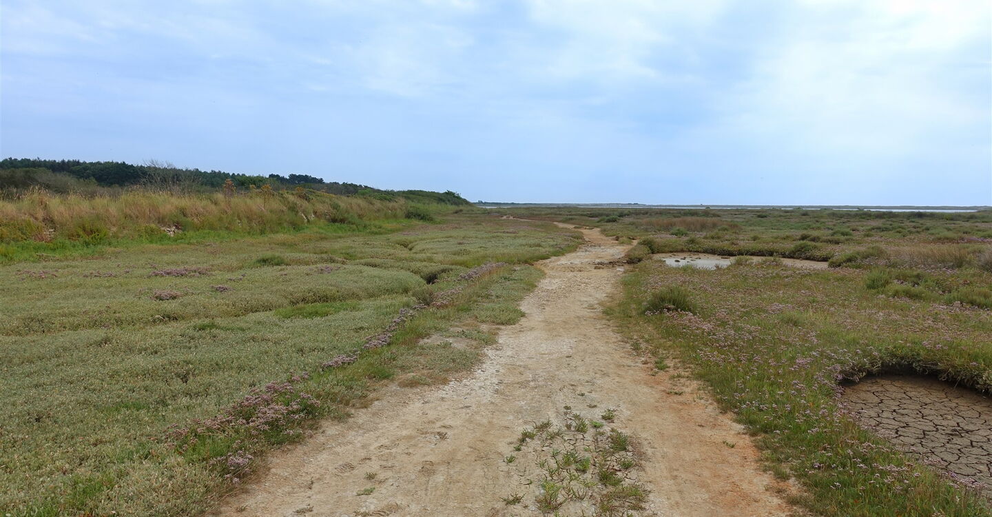 Hinter einer Zufahrtsstraße geht es wieder direkt am Strand entlang. Kurz später laufen wir ein kurzes Stück auf einer Straße. Der Pfad führt nun in einem großen Bogen an einer Bucht entlang, direkt auf eine Kirche zu. Auf einem markierten Wegstück erreichen wir über extrem schmale Gassen – teilweise muss man den Rucksack abnehmen, um überhaupt hindurchzukommen – die Straße, an der wir rechts gehen, sodass wir an der 02 Église Sainte Radegonde (2 m) vorbeikommen. Direkt hinter dem Damm gehen wir rechts. Bei der darauffolgenden Weggabelung gehen wir nicht halb rechts zum Meeres- und Naturmuseum La Maison de l'Ile Kerner, das auf der Halbinsel in der Lagune liegt, sondern halb links, um nach 250 m hinter der kleinen Grünanlage nach rechts abzubiegen. Dieses Wegstück ist auch ausgeschildert. Nachdem der Weg einmal seine Richtung nach rechts und dann nach links geändert hat, gehen wir wieder parallel zu den Marschwiesen in der Lagune. Der weitere Weg: Es geht vorbei an einem Parkplatz mit Picknicktischen, einen linken Abzweiger nach Le Dreff ignorieren wir. Der Pfad führt direkt über die Marschwiesen und es geht über einen künstlich angelegten Damm.