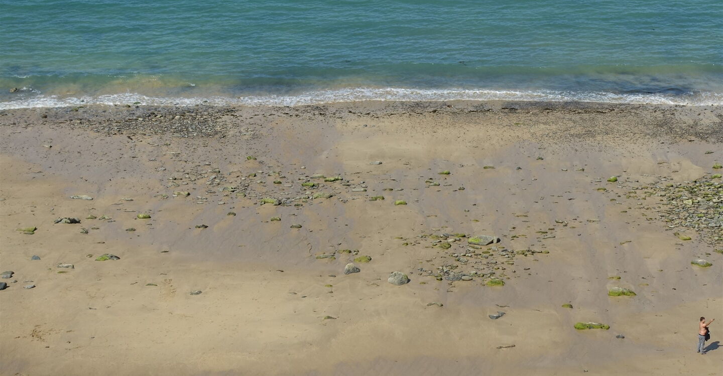 Auf der Straße gehen wir ein kurzes Stück des Hinwegs zurück und dann weiter geradeaus bis zum Ende der Straße – hier befindet sich ein riesiger Feigenbaum unter einer mächtigen Pinie. Wir gehen links an der Mauer entlang und folgen dem Zöllnerpfad. Dieser mündet in die Kehre einer Straße. Wir gehen halb rechts und in der nachfolgenden scharfen Rechtskurve der Straße gehen wir geradeaus auf dem GR34 weiter. Bei einer Hafenmole erreichen wir das nördliche Ende der Halbinsel, rechts befinden sich die große Bucht 03 La Lieue de Gréve (13 m) und ein kleiner windgeschützter Hafen, links der Plage de Beg Douar.