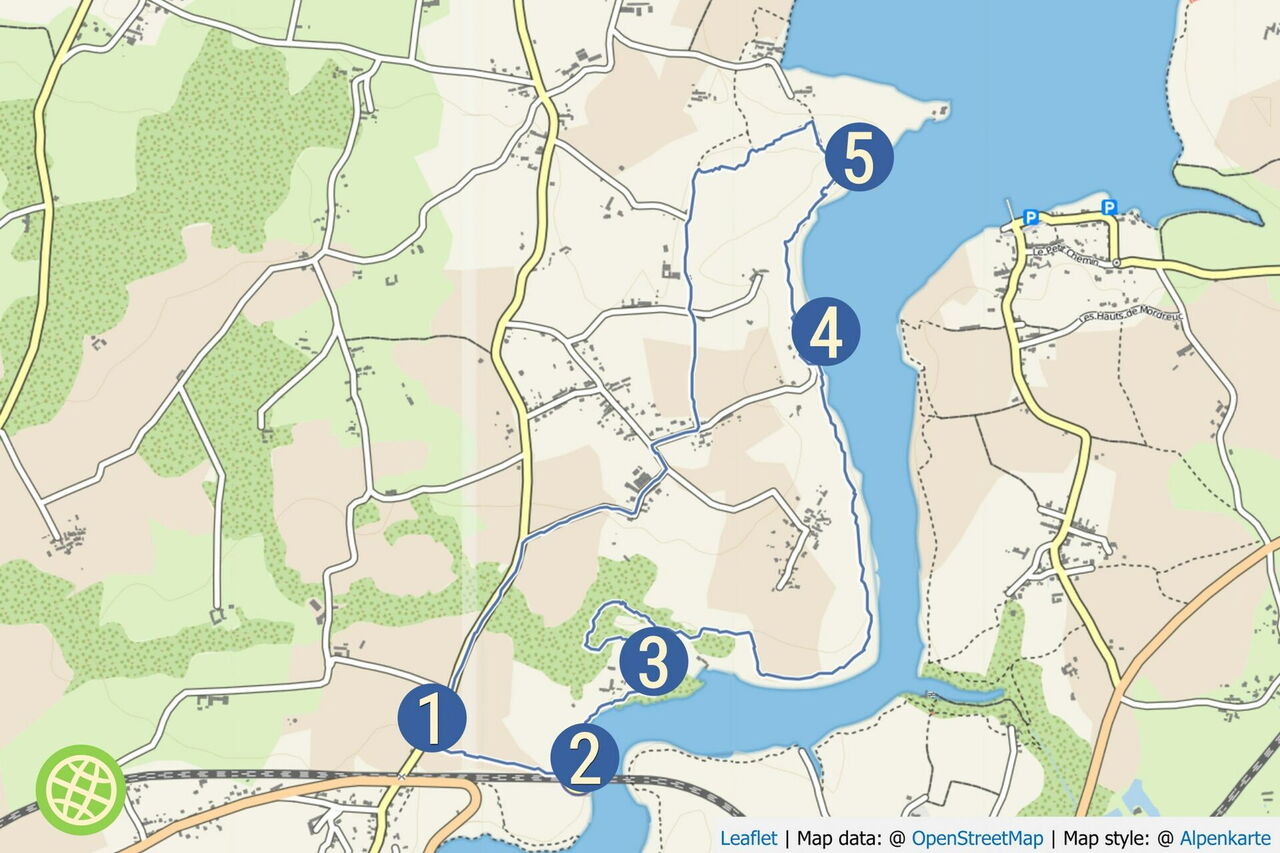 Von der Parkbucht an der D12, dem 01 Start und Ziel (44 m), überqueren wir die D12 und gehen auf dem Pfad entlang der Straße Richtung Norden. Hinter der rechts zu einem Herrenhaus abzweigenden Straße geht es direkt an der Straße entlang. Nachdem wir eine Senke durchlaufen haben, verlassen wir die Hauptstraße nach halb rechts. Bei einigen Häusern macht die Straße eine Linkskehre. Dort, wo die Straße endet – rechts geht es in eine Sackgasse –, gehen wir links und bei der nächsten Möglichkeit rechts. Rechts am Straßenrand befindet sich auch ein Heiligenschrein. Nach 160 m, hinter einem Steinhaus mit hellblauen Fensterläden, zweigt links – zwischen zwei Häusern hindurch – ein auf die Felder führender Weg ab!