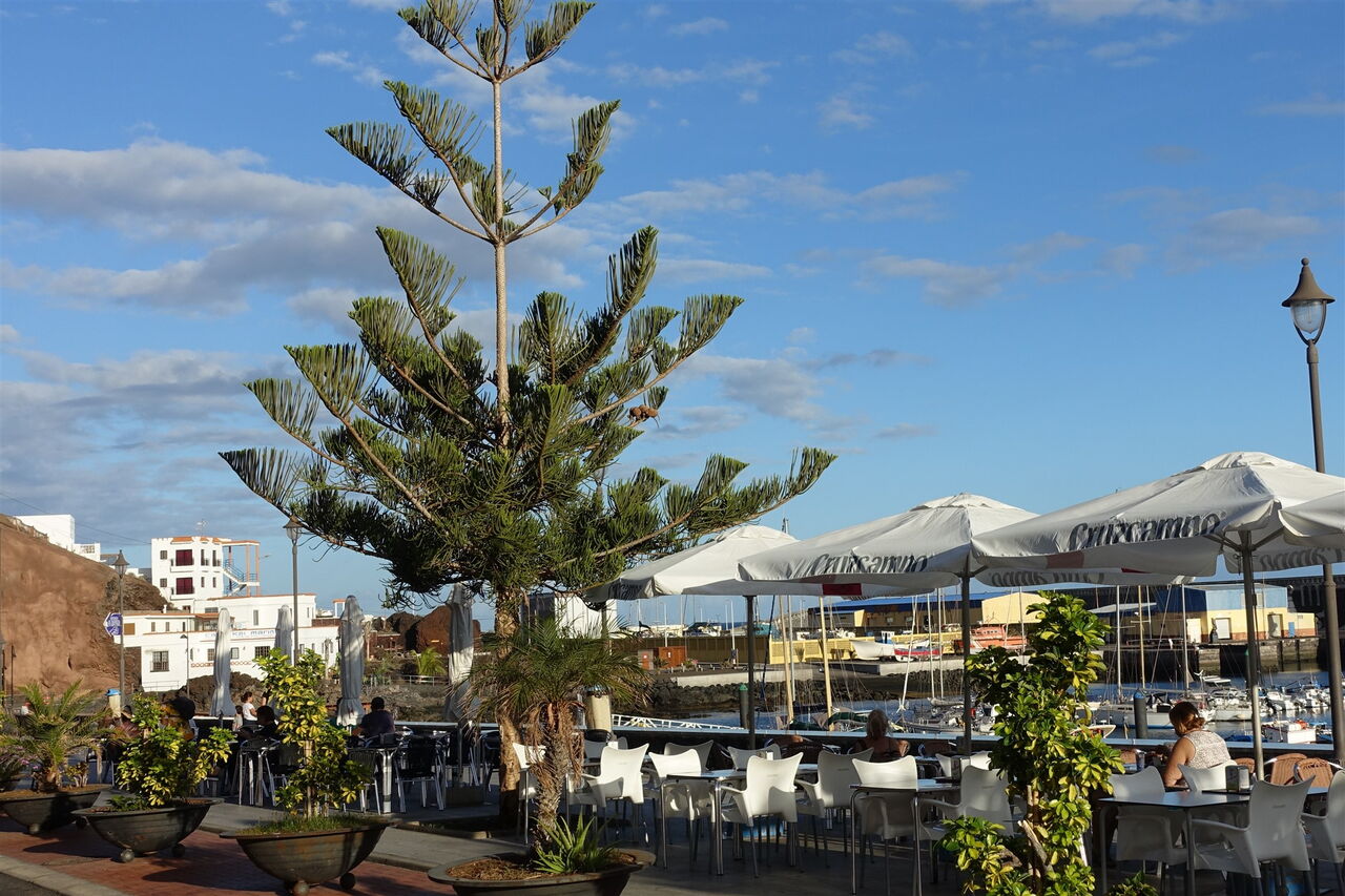 Von nun steigen wir auf Ziegenpfaden auf dem halb rechts von uns liegenden Bergrücken bis zum Gipfel der (05) Montana Restinga (209 m) auf. Dabei kann es sehr windig werden, denn die Passatwinde treffen ungebremst auf die ersten Hügelketten von El Hierro. Am Gipfel angekommen, schauen wir aus der Vogelperspektive auf das kleine Fischerdorf La Restinga. Zum Abstieg gehen wir weitere 70 m halb links auf dem Vulkankrater, um uns dann auf einem nicht so steilen, aber trotzdem gerölligen und rutschigen Untergrund in Richtung des rotbraunen Gebäudes zu orientieren, welches sich halb links unterhalb befindet. Kurz unterhalb des Gebäudes steht ein Strommast, bei dem wir auf einen Pfad Richtung La Restinga treffen. Dieser führt an der Bushaltestelle vorbei und auf einer der Straßen geht es bis zum Hafengelände herunter.
