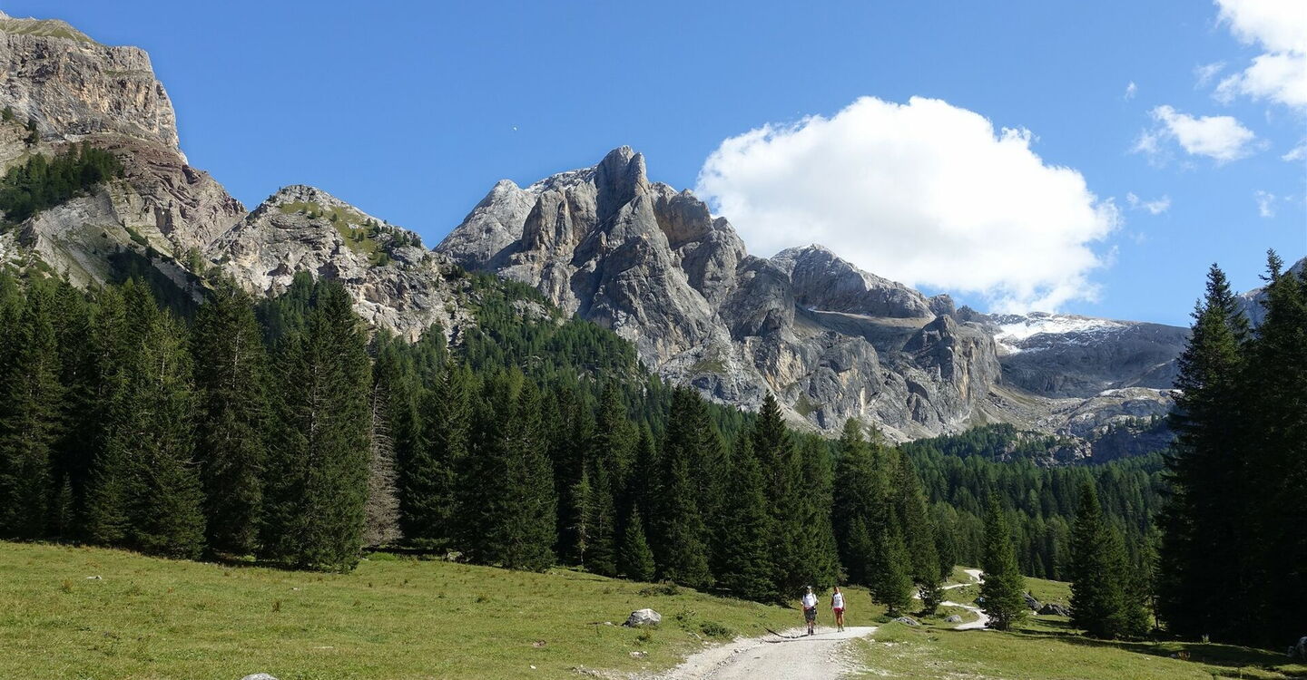 Auf dieser Forststraße gehen wir nun durch das wunderschön gelegene Val Contrin taleinwärts. Es geht an Kühen, Pferden, Schafen und Eseln vorbei, die sich auf den weiten Weideflächen sichtlich wohlfühlen. Bei km 9,8 kommen wir am Baita Cianci vorbei – eine nette Einkehrmöglichkeit, wo man auch übernachten kann. Wir erreichen das heutige Etappenziel, das 05 Rifugio Contrin (2.016 m).