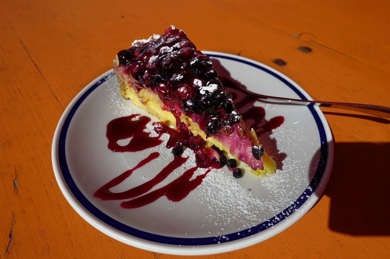 Wir befinden uns jetzt auf einem alten Maultierpfad, der seit Mitte des 18. Jahrhunderts genutzt wurde, um die Touristen dichter an die Marmolata heranzubringen. Den rechten Abzweiger hinter einer Hütte ignorieren wir. Nach mehreren Heiligenschreinen mündet der Pfad in eine asphaltierte Zufahrtsstraße, wir erreichen die 02 Albergo Viletta Maria (1.664 m). Hinter der nächsten Brücke verlassen wir die Straße bereits wieder nach links, auf dem Forstweg geht es weiter bergab.