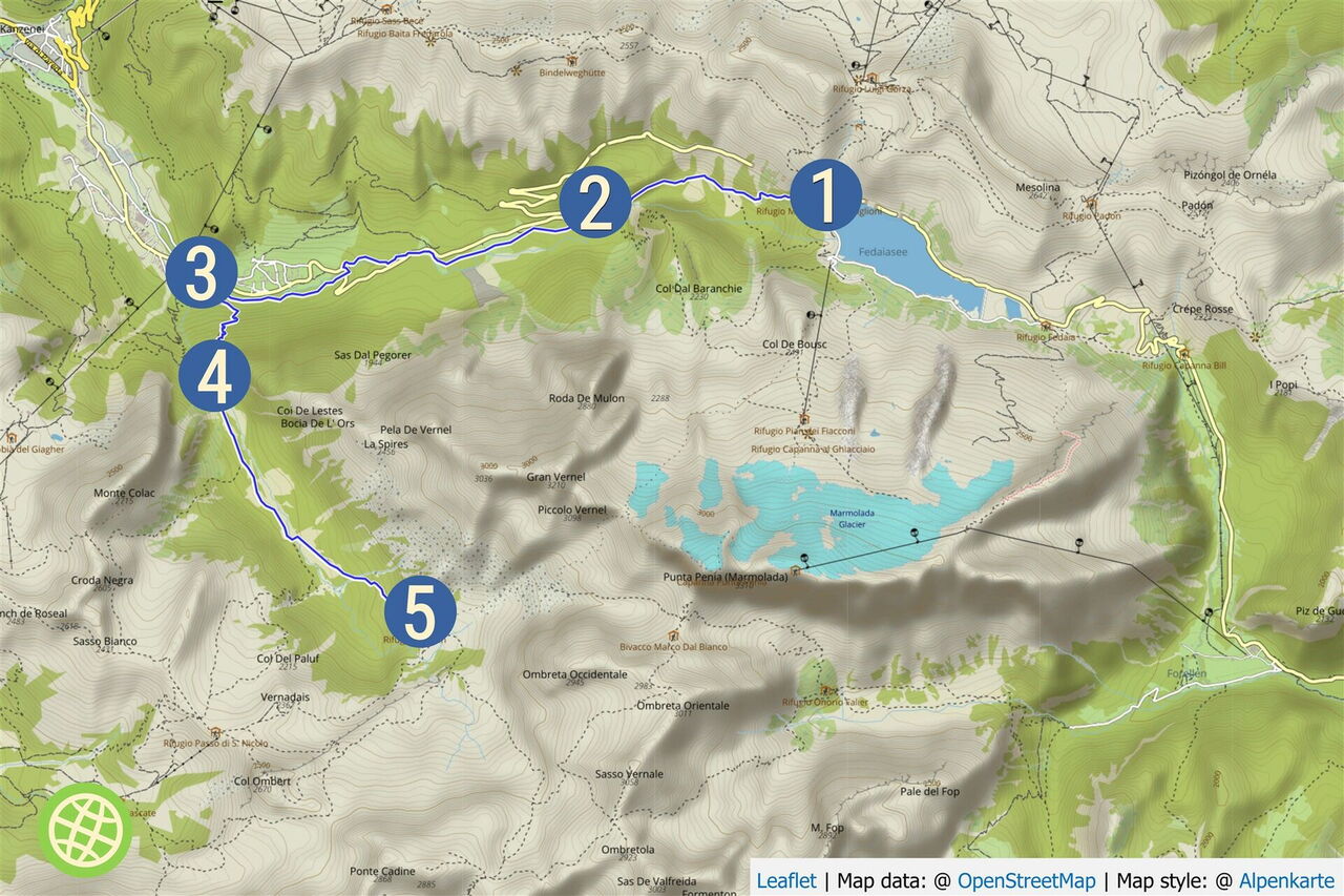 Leichte Wanderung auf Forstwegen und Pfaden, erhöhter Navigationsaufwand aufgrund vieler Abzweiger. Art des Weges: 5 % Straße, 40 % Pfad und 55 % Schotterpiste. Zusatzausrüstung: keine. Einkehr: km 2,4 Albergo Viletta Maria, km 9,8 Baita Cianci und km 11,0 Rifugio Contrin. Beste Wanderzeit: Ende Juni bis Anfang Oktober. Variante: Der erfahrene Alpinist überquert die Marmolata wie in Tour 53 (Variante 2.3) beschrieben.