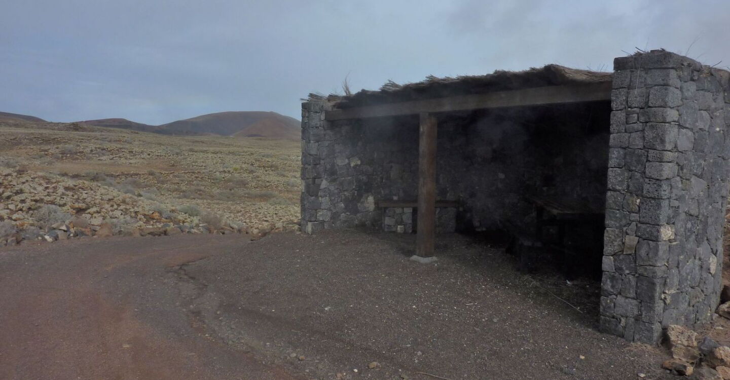 Und wie aus dem Nichts treffen wir nach weiteren 250 m auf ein windgeschütztes (05) Picknickhaus (125 m) – oder eine Unterstellmöglichkeit bei Regen. Was sich die Inselregierung wohl bei der Planung dieser Picknickstelle gedacht hat? Nach weiteren 1,5 km erreichen wir die ersten Häuser von Lajares. 600 m weiter münden von rechts zwei Ausfahrtsstraßen auf den Hauptweg. Nach 400 m auf der zweiten Straße gelangen wir auf der folgenden Asphaltstraße rechts zum Parkplatz.