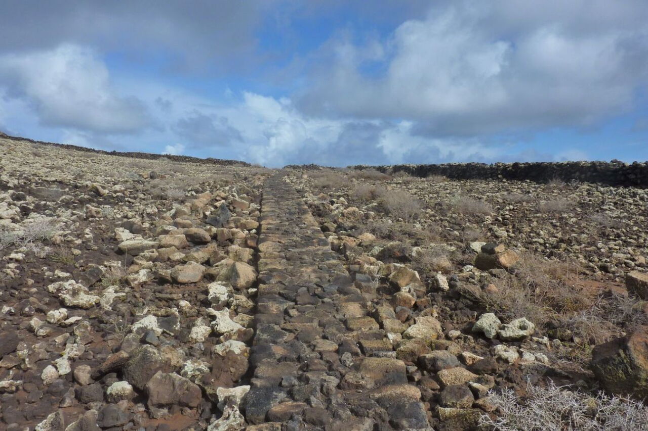 In östliche Richtung führt ein Pfad weg vom vereinzelt stehenden Gebäude, vorbei an brachliegenden Feldern, zu einem markanten aufrecht stehenden Felsen, den man schon aus der Ferne ausmachen kann. Wenn wir an diesem Stein auf der Schotterpiste links gehen, gelangen wir nach Corralejo. Wir gehen aber rechts in (04) Richtung Lajares (189 m). Nach 1,2 km auf der Schotterpiste gehen wir bei der folgenden Weggabelung erneut rechts. Nach weiteren 700 m verlassen wir den Hauptweg und gehen nun halb rechts auf dem Nebenweg weiter.