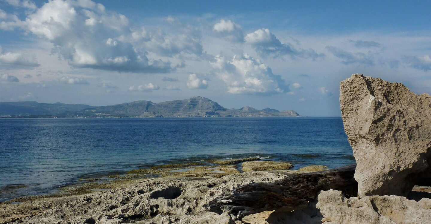 Hier gehen wir nicht geradeaus in Richtung des 190 m entfernten Mauerdurchbruchs, sondern halten uns halb links und gehen im weiteren Verlauf an den Überresten einer Mauer bis zu einer kleinen (03) Bucht (1 m) vor. Schauen wir Richtung Norden an der Küste entlang, so sehen wir die Strände Kalathos, Masari und Charaki. Im Hintergrund erkennt man den felsigen Berg Profitis Ilias und bei sehr guter Sicht sogar den dahinter liegenden Berg mit der Tsambika-Kapelle. Wir gehen 70 m direkt an der Küste mit ihren bizarren Sandsteinobjekten entlang, wechseln dann aber bei einer Minihöhle und den Überresten einer antiken Stätte auf die leicht ansteigende Steilküste.