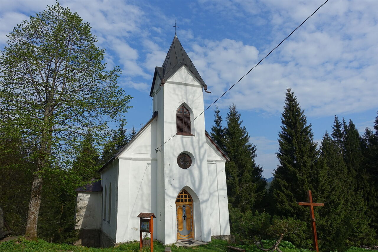 Von der Kirche 01 Magurka cirkevné (1021 m) gehen wir auf der weiterführenden Straße durch das Bergdorf Magurka und an der Chata Magurka vorbei. Bevor die Straße durch das Bachbett führen würde, gehen wir scharf rechts und kommen an drei in den Hang gebauten Häusern vorbei. Auf dem nachfolgenden Wegabschnitt durch den Wald ignorieren wir den rechten und linken Abzweiger. Bei der Lichtung ignorieren wir ebenfalls alle Abzweiger und gehen auf dem steil ansteigenden Pfad weiter.