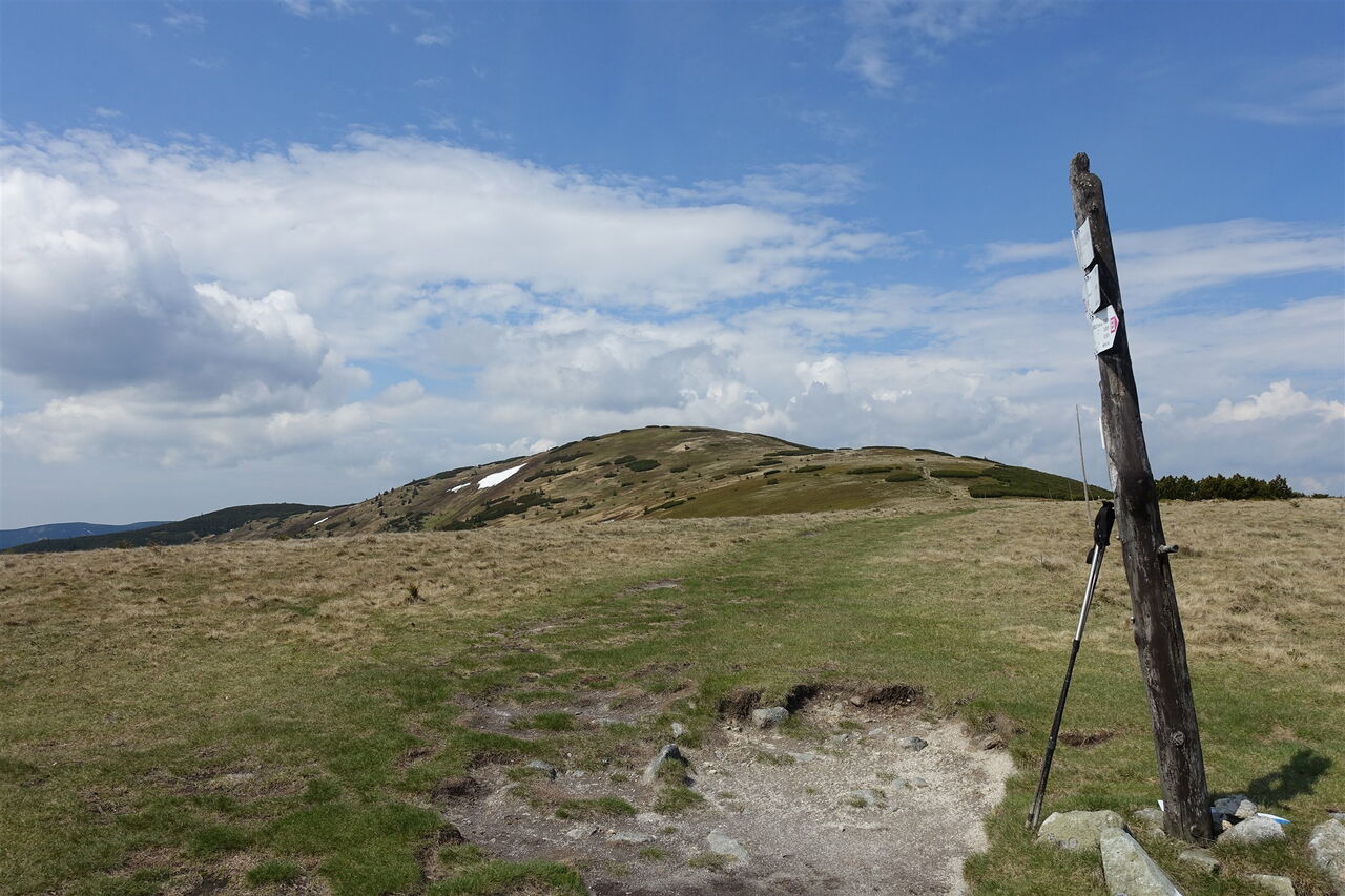 Nach ca. 500 m erreichen wir den unscheinbaren Gipfel 03 Zámostskej hol'a (1630 m), überschreiten ihn und gelangen auf den Fernwanderweg E8, den wir in westliche Richtung weiter begehen.