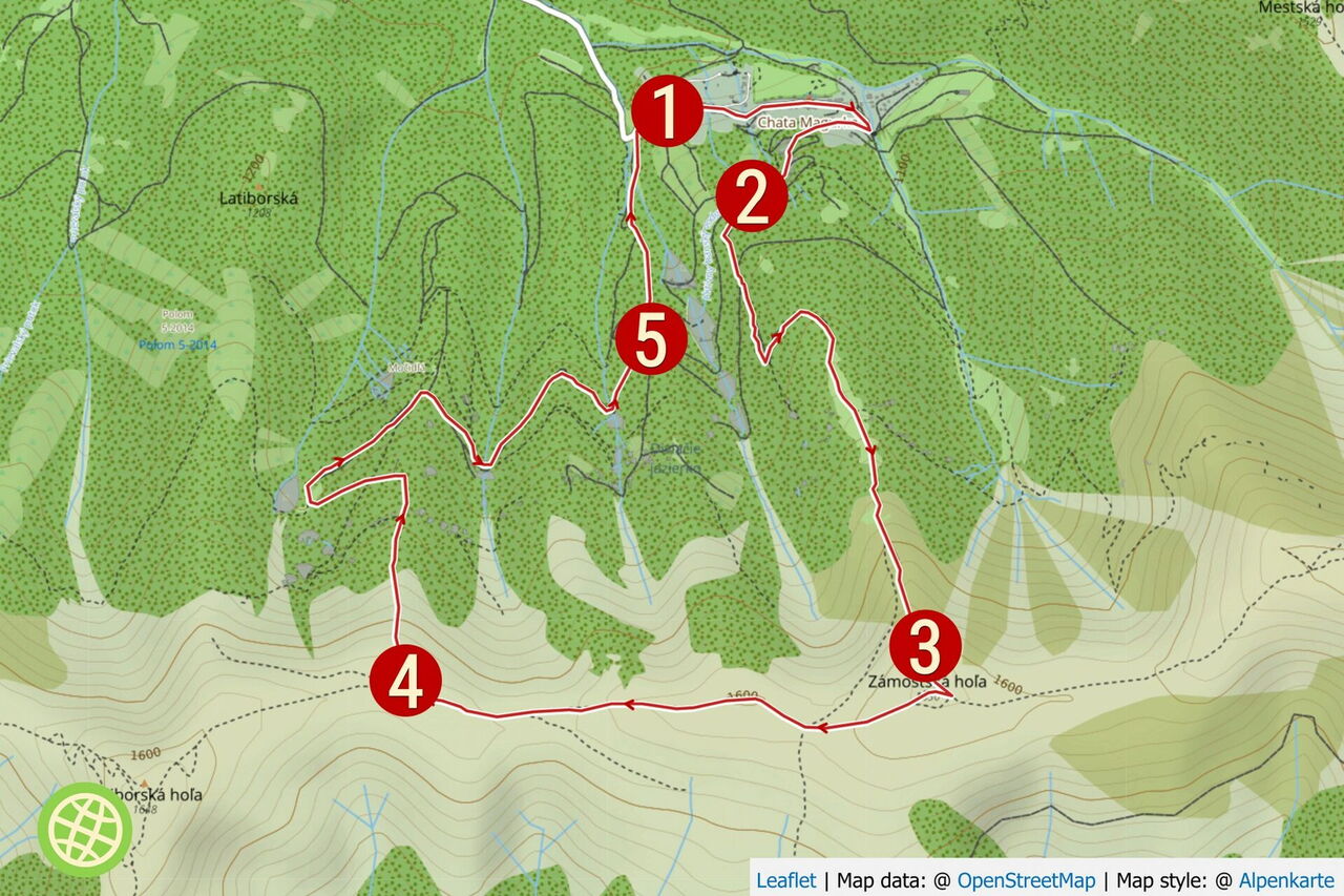 Nach kurzem Abstieg erreichen wir die 1591 m hohe Einsattelung Sedlo Zamostskej Hole. Von rechts führt ein weiterer Wanderweg aus Magurka auf die Höhen des Hauptbergrückens der Niederen Tatra. Wir marschieren an Steinhaufen vorbei bis zur Einsattelung 04 Latiborskej sedlo (1555 m). Hier endet unser kurzes Gastspiel auf dem Fernwanderweg, denn wir beginnen auf dem rechts bergab führenden Pfad mit dem Abstieg. Dieser ist blau markiert und ausgeschildert Richtung Bašovňa. Der Pfad ist geröllig und steil und mündet nach einer Linkskehre in einen Fahrweg, auf dem wir rechts weiter bergab gehen.