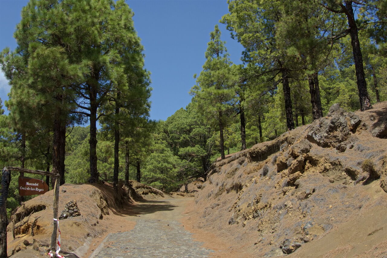 Kurz bevor unsere Piste in eine weitere mündet, führt auf der linken Seite ein Trampelpfad zur (02) ältesten Kiefer von El Hierro (1188 m). Aufgrund des langsamen Wachstums in dieser Region und eines unteren Stammdurchmessers von 2–3 m wird sie auf 400–600 Jahre geschätzt; ein wahres Juwel mit ihren tentakelartigen und mächtigen Ästen. Wieder auf der Forststraße wandern wir bei der Fuente de Julan auf dem rechten bergauf führenden Weg Richtung Cruz de Los Reyes und Sabinosa. Nach steilem Aufstieg erreichen wir eine Weggabelung. Hier nehmen wir den halblinken Abzweiger, kommen vorbei an der Fuente Cruz de Los Reyes und queren im weiteren Verlauf eine Straße. Bei der Dreiwegegabelung entscheiden wir uns für den mittleren Weg, der in Richtung der ausgeschilderten Parkplätze führt. Noch vor der großen freien Fläche orientieren wir uns rechts bergauf, um an der Asphaltstraße links zu gehen.