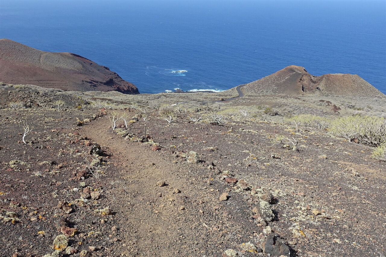 Der Vulkan Lomo Negro, an dem wir uns jetzt befinden, liegt am Ende des Westkammes der vulkanischen Aktivitäten auf El Hierro, in einem Gebiet, das vor etwa 1800 Jahren entstanden ist. Vom Aussichtspunkt kann man sehr schön die Flussrichtung der Lavaströme nachverfolgen: nach rechts Richtung Arco de la Tosca, gerade herunter zum Roque de la Sal und nach links zum Punta del Verdol. Direkt hinter dem (01) Mirador de Lomo Negro 1 (299 m) und der Straße beginnt der angelegte Pfad durch die Vulkanlandschaft zum nächsten Aussichtspunkt.