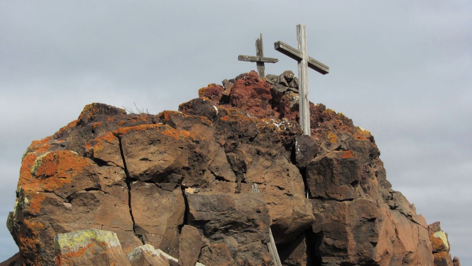 Es folgt ein weiteres Stück mit mäßiger Steigung, bevor der endgültige Anstieg bis zur (05) Montana Areguia (492 m) beginnt. Das Gipfelkreuz liegt etwas erhöht auf einem Basaltsteinkomplex. Die Aussicht unterhalb des Gipfelkreuzes ist einfach gigantisch. Der Blick von hier oben ist atemberaubend. Man schaut auf die wilde Westküste von Fuerteventura, weiter links erkennt man an den Sandfarben die Dünenlandschaft des Jandia-Nationalparks und am Horizont erheben sich die südlichsten Gipfel der Insel.