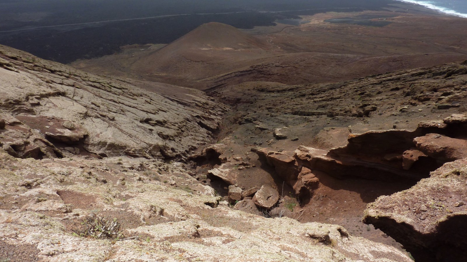 Im oberen Teil der Durchschreitung teilt sich das Barranco abermals. Hier gehen wir zunächst rechts - weil der Weg einfacher ist -, aber nach einigen Metern gehen wir durch den linken Barranco-Arm weiter. Verschiedene Steinfarben und Impressionen lassen uns eine Weile verharren. Nach weiteren 500 m verlassen wir das Barranco und werden auch prompt von dem in der Regel stark wehenden Nordost-Passat erfasst. Wir lassen noch die restlichen Meter zum Gipfel der (03) Montaña de Teneza (368 m) hinter uns. Schaut man von hier aus Richtung Süden, kann man sehr schön erkennen, wie sich die Lava bei den Ausbrüchen von 1730-1736 ihren Weg Richtung Meer gebahnt hat. Wie mit einem Lineal gezogen, trennt eine imaginäre Linie die kultivierten Flächen vom Lavastrom. In südwestlicher Richtung thront der Krater Caldera Blanca.