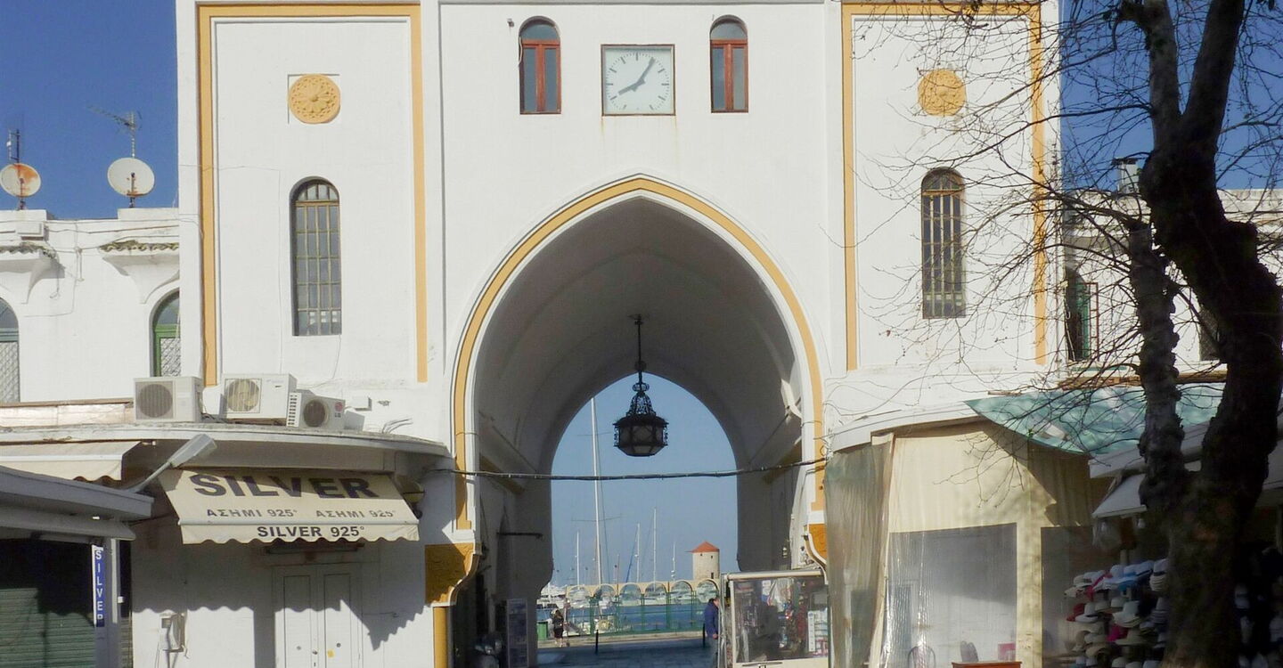 Sobald wir halb links auf der anderen Straßenseite Kuppeln sehen – sie vermitteln eher das Erscheinungsbild einer prächtigen Moschee aus der Zeit der türkischen Herrschaft –, gehen wir durch den Haupteingang in den (02) Neuen Markt – Nea Agora (3 m). In unmittelbarer Nähe der mittelalterlichen Stadt, am Mandrakihafen gelegen, haben die Italiener einen Marktplatz errichtet. In der hofartigen Anlage mit einem markanten Pavillon in der Mitte, unzähligen Ständen und Geschäften, Cafés, Tavernen und Restaurants tummeln sich Einheimische und Touristen.