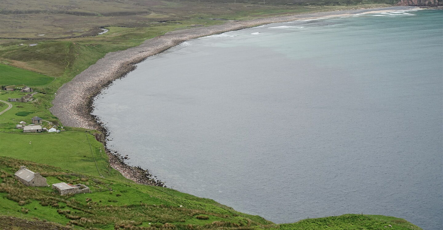 Wir erreichen einen Betonsockel. Ab diesem Messpunkt ist wieder ein schmaler Trampelpfad auszumachen. Bei aufgestellten Steinplatten beginnen wir nun halb rechts mit dem Abstieg über die Almwiesen Schottlands. Wir erreichen den oberen Klippenrand, beim Blick auf das 332 m tiefer gelegene Meer stockt automatisch der Atem. Vor uns thront das 03 St John's Head (332 m), mit 343 m ist es die am steilsten abfallende Klippe Großbritanniens. 1970 wurde sie erstmals bestiegen. Von nun an folgen wir dem Küstenpfad bis zur Laeden Geo. Eine an ihrer engsten Stelle 3–5 m breite Rinne fällt aus 328 m Höhe steil bis zum Meer ab, mittig hat sich dekorativ ein großer Stein verkeilt.