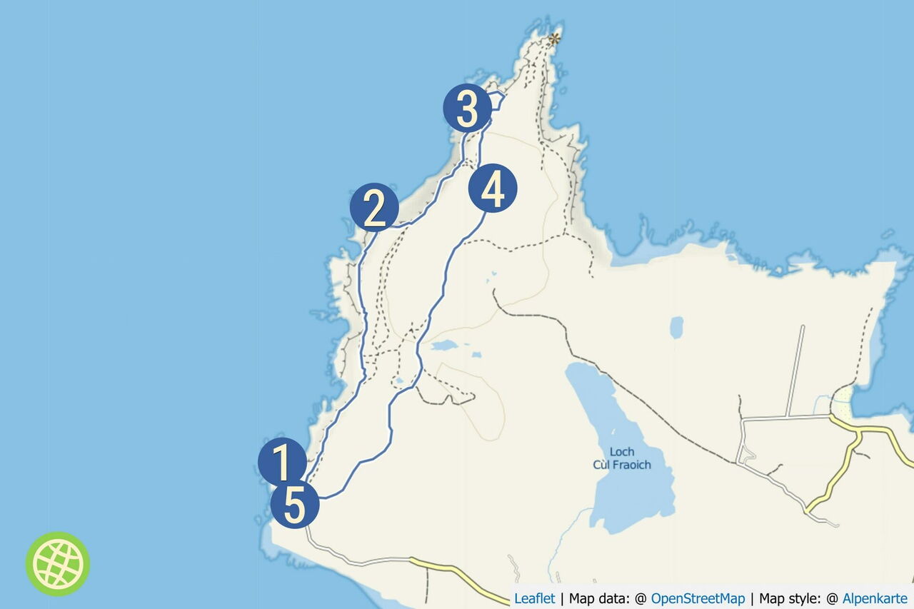 Wir gehen in südliche Richtung auf einem schwach ausgeprägten Bergrücken – der Pfad ist aber gut zu erkennen –, bis wir halb links in der Ferne eine Schotterpiste sehen. Wir queren zu dieser herüber und gehen auf ihr bis zum Parkplatz beim Ausgangspunkt zurück. Es empfiehlt sich noch ein Abstecher zum oberhalb gelegenen 05 Leuchtturm Stoer (58 m). Er wurde 1870 erbaut, sendet alle 15 Minuten ein Leuchtfeuer und hat eine Reichweite von beachtlichen 43 km.