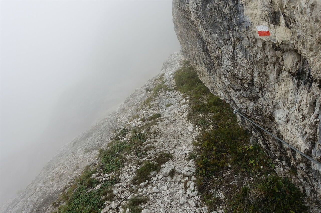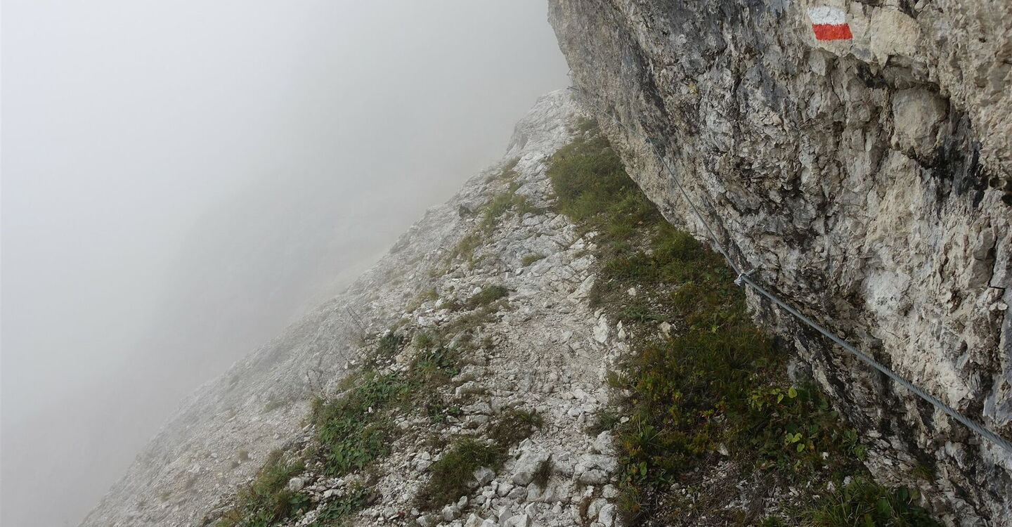 Es folgt ein langer Aufstieg durch nahezu baumloses Gelände. Rechts von uns erheben sich die majestätischen Spitzen des 2.300 m hohen Sasso Largo und des 2.310 m hohen Sasso delle Undici. Auf einem gerölligen Pfad steigen wir kontinuierlich auf und erreichen in den Fels geschlagene Metalltritte und abschnittsweise Drahtseilsicherungen an einem Schuttband, teils Felsband. Nochmals wird das Gelände steiler. Von nun an ist der Untergrund so fest komprimiert, dass es schwierig ist, einen sicheren Tritt zu finden. Bei schlechtem Wetter, insbesondere bei Schnee oder Eis, ist dieser Wegabschnitt extrem gefährlich und dem erfahrenen Bergsteiger vorbehalten! Mühsam geht es in engen Kehren bergauf, bis wir in einem weiteren Schotterfeld auf die Überreste von Holzbohlen stoßen, die zur Befestigung des alten Weges dienten. Aufgrund mehrerer Felsabbrüche und Steinschlaggefahr wurde der Pfad aus Sicherheitsgründen verlegt. An dieser Stelle gehen wir nicht rechts bergauf, sondern geradeaus weiter. Wir erreichen den 04 Passo del Comedon (2.130 m). Eines der schwersten Teilstücke des Dolomitenhöhenweges Nr. 2 ist geschafft!