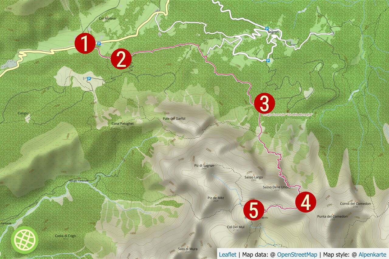 Die Wanderung ist in der Cimonegagruppe angesiedelt, einem Gebirgsmassiv der Feltriner Dolomiten. Der 6,8 km lange und extrem steile Aufstieg – abschnittsweise Drahtseilsicherungen an einem Schuttband, teils Felsband – bis zum 2.130 m hohen Passo del Comedon zählt mit zu den schwierigsten Etappen des Dolomitenhöhenwegs Nr. 2. Dort angekommen ergibt sich dann eine fantastische Fernsicht auf die umliegende Bergwelt. Im Südosten ragt einsam die 2.320 m hohe Punta di Comdeon in den Himmel. Richtung Norden erheben sich majestätisch die südlichen Ausläufer der Pale di San Martino. Im Südwesten erhebt sich der höchste Berg der Cimonegagruppe, der 2.522 m hohe Sass de Mura. Diese Höhentour ist ein Naturspektakel mit atemberaubenden Eindrücken und fantastischen Tiefblicken.