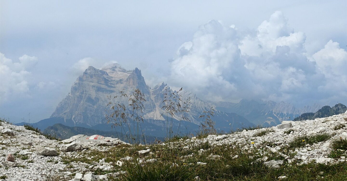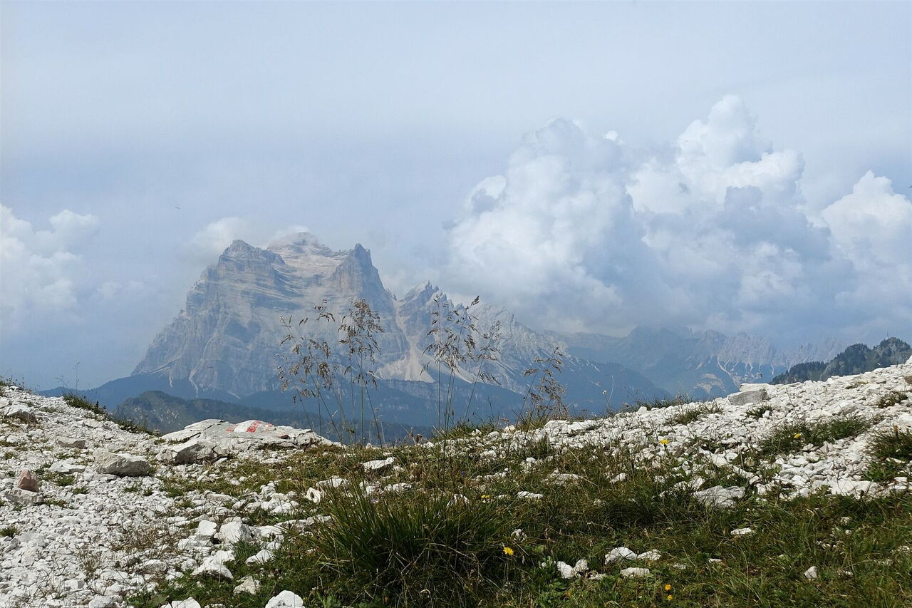 Noch auf den nördlichen Hängen des Bergmassivs erreichen wir eine erste Einsattelung, von der wir aber noch weiter auf dem östlich ausgerichteten Bergrücken aufsteigen, um dann die 03 Forcella Bela (2.112 m) zu erreichen. Von hier ergibt sich ein faszinierender Fernblick in nordwestliche Richtung auf den 2.183 m hohen Monte Rita und die dahinterliegenden Berge Civetta, Marmolata, Monte Pelmo, Tofane, Sorapiss (südöstlich von Cortina d'Ampezzo), Monte Antelao (der höchste Berg der Ampezzaner Dolomiten) und Marmarole. Jenseits der Scharte steigen wir durch steile, mit Gras bewachsene enge Kehren bis zu einer ersten Weggabelung ab. Hier gehen wir nicht links zum Gipfel des Sassolungo di Cibiana, sondern geradeaus weiter auf dem Wanderweg 483 Richtung Bivacco Campestrin.