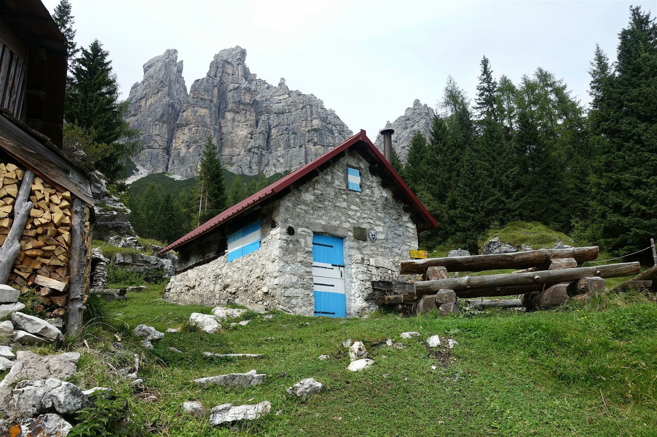 Wir steigen über gerölligen und rutschigen Untergrund in einem Talkessel ab, der von den riesigen Dolomitfelswänden der südlichen Bosconerogruppe eingefasst wird. Nachdem wir die Latschenkiefern hinter uns gelassen haben, erreichen wir federnden Waldboden und das 04 Bivacco Casera Campestrin (1.658 m). Hier gibt es direkt an der Hütte eine Quelle. Auf einem eindeutig auszumachenden Pfad geht es talwärts, teilweise in steilen und engen Kehren, bis wir bei Wiesengelände die Casera Valbona (1.241 m) erreichen, die seit den 1960er Jahren nicht mehr bewirtschaftet wird.