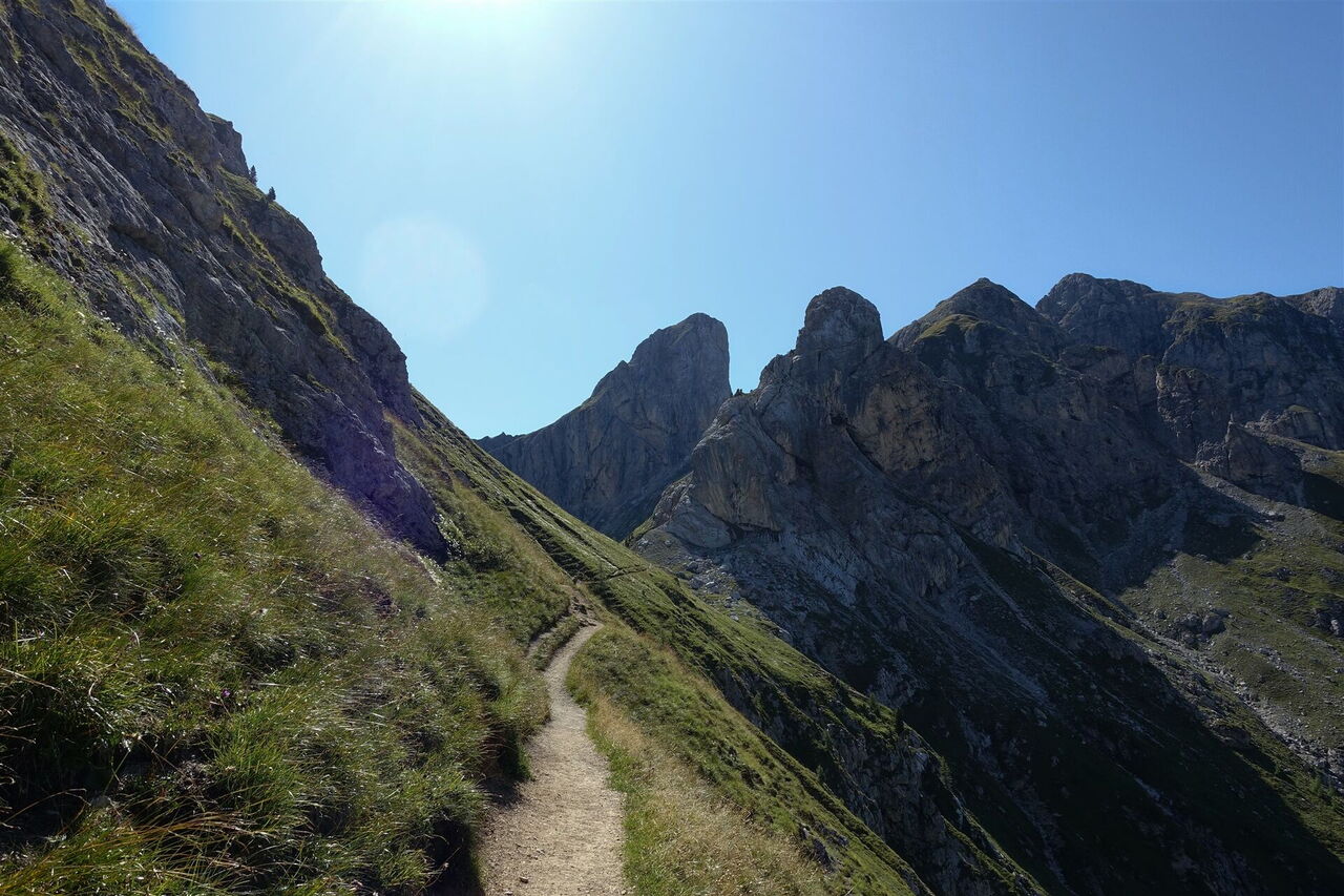 Unterhalb der kleinen Kapelle am 01 Passo di Giau (2.236 m) wandern wir in südöstlicher Richtung auf dem Wanderweg 467 Richtung Passo Staulanza/Wanderweg 436 Richtung Forcella di Giau. Schnell ist die Forcella di Zonia (2.229 m) erreicht, wo sich weitere Wegweiser befinden. Der nachfolgende Pfad führt durch steile Bergwiesen bis zur Forcella de Col Piombin (2.239 m). Von nun an geht es leicht bergab, durch das Reich der Murmeltiere, bis zu einer weiteren Wegkreuzung.