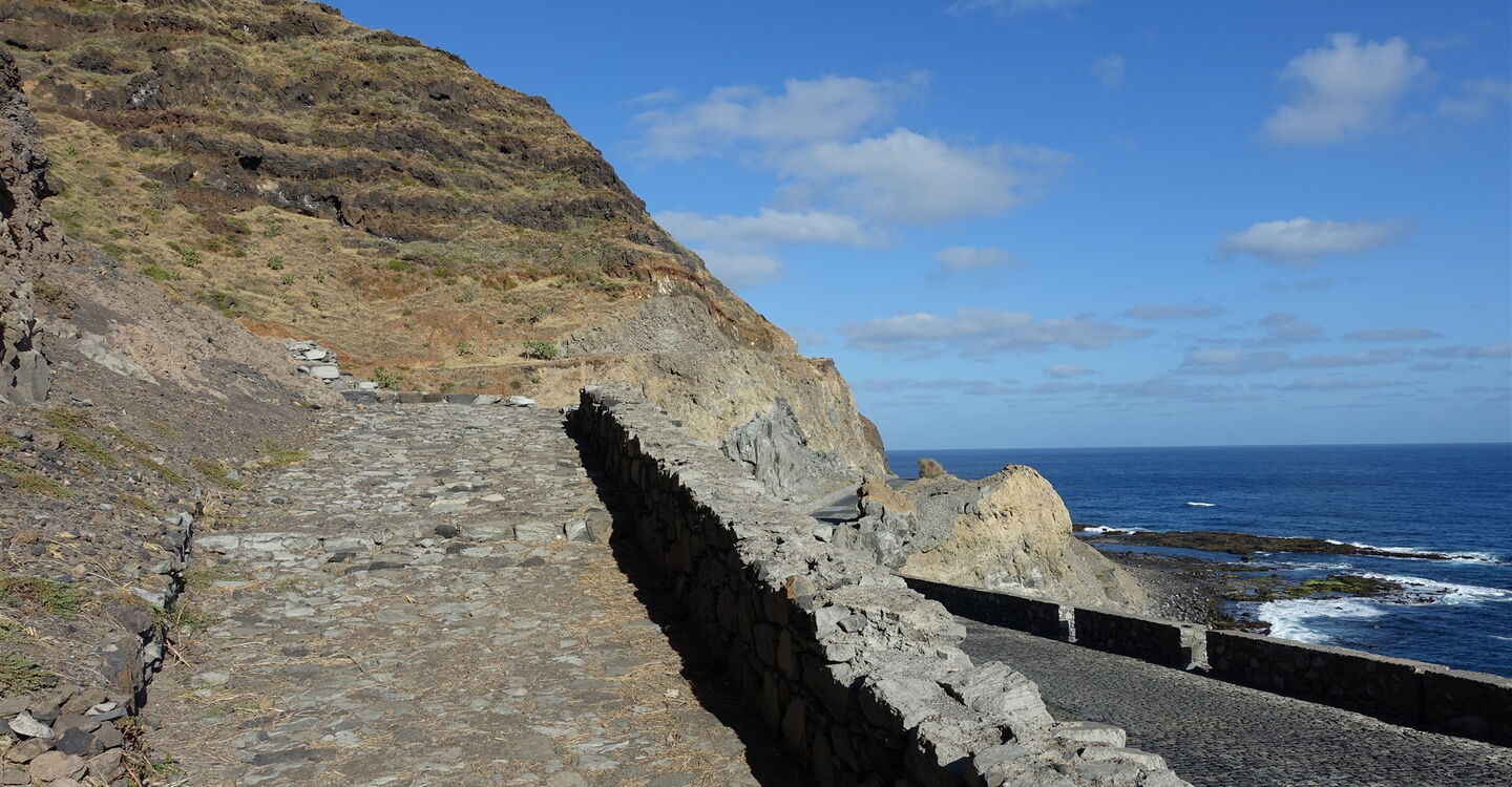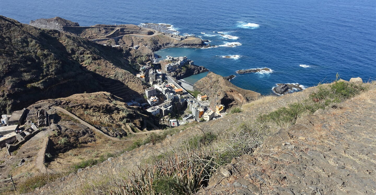 Aufgrund der einmaligen und atemberaubenden Blicke ins Tal und der Fernsicht entlang der Küste von Santo Antão, über das weite Rund des sattgrünen Figueiral de Paúl Tals bis zur bewaldeten Spitze des 1585 m hohen Pico da Cruz, gehört diese Tour zu den schönsten im Nordosten der Insel. Während sich im Tal Figueiral de Paúl das touristische Hauptgeschehen abspielt, wandern wir auf Routen fernab jeglichen Tourismus. Abschnittsweise führt der Pfad über einen ausgesetzten Grat eines Bergrückens, der bis zu 1000 Höhenmeter in den Talgrund abbricht. Man hat das Gefühl, man läuft auf einem Skywalk. Wir genießen Glücksmomente in luftiger Höhe.