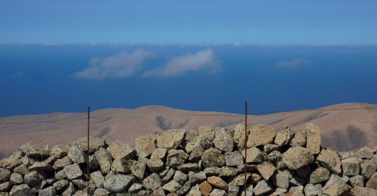 Auf dem mäßig ansteigenden Bergrücken erreichen wir auf leicht gerölligem Untergrund den (04) Pico de Betancuria (724 m). Wir haben es geschafft und genießen den imposanten 360°-Rundblick. Am Gipfel treffen drei Grundstückbegrenzungsmauern zusammen, hinter denen man bei einem stark wehenden Passatwind Schutz findet.