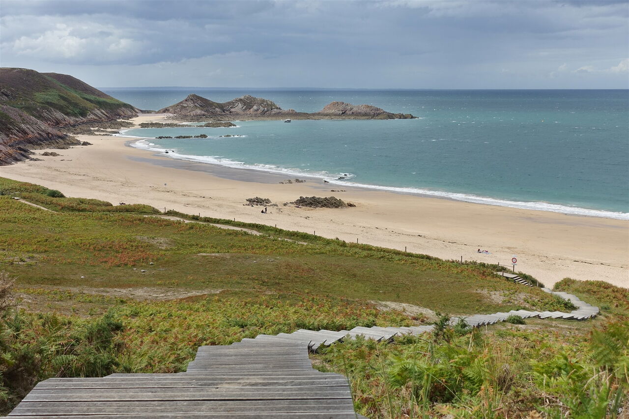Nach kurzem Fußmarsch sehen wir unterhalb den bei Ebbe 900 m langen 03 Plage de Lourtuais (40 m) – ein wahrer Traumstrand, besonders schön ist er am westlichen Ende, wo ein kleines Kap Schutz vor dem Nordwestwind bietet. Wir gehen auf dem rechts bergab führenden Treppenweg zunächst Richtung Strand, um dann aber direkt vor dem Strand links auf einem Weg oberhalb der Dünen zu wandern. Bei dem nachfolgenden zweiten Zugang zum Strand beginnen wir links auf dem weiterführenden Pfad aufzusteigen. Auf dem breit angelegten Weg gehen wir weiter, bis rechts ein mit Holzbalken befestigter Pfad abzweigt.