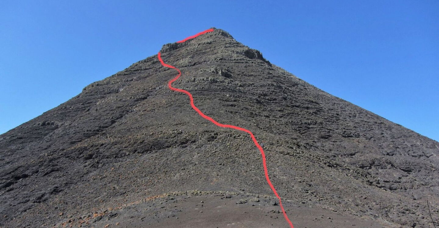 Direkt hinter dem (01) Start und Ziel (250 m), dem Mirador Degollada de Agua Oveja, erhebt sich in westliche Richtung der Pico las Pilas. Zunächst gehen wir auf dem seichten Bergrücken, bis wir am Fuße der Pyramide angekommen sind. Da das Gelände sehr steil und rutschig ist, lässt es sich in einem der vielen Barrancos besser aufsteigen.
