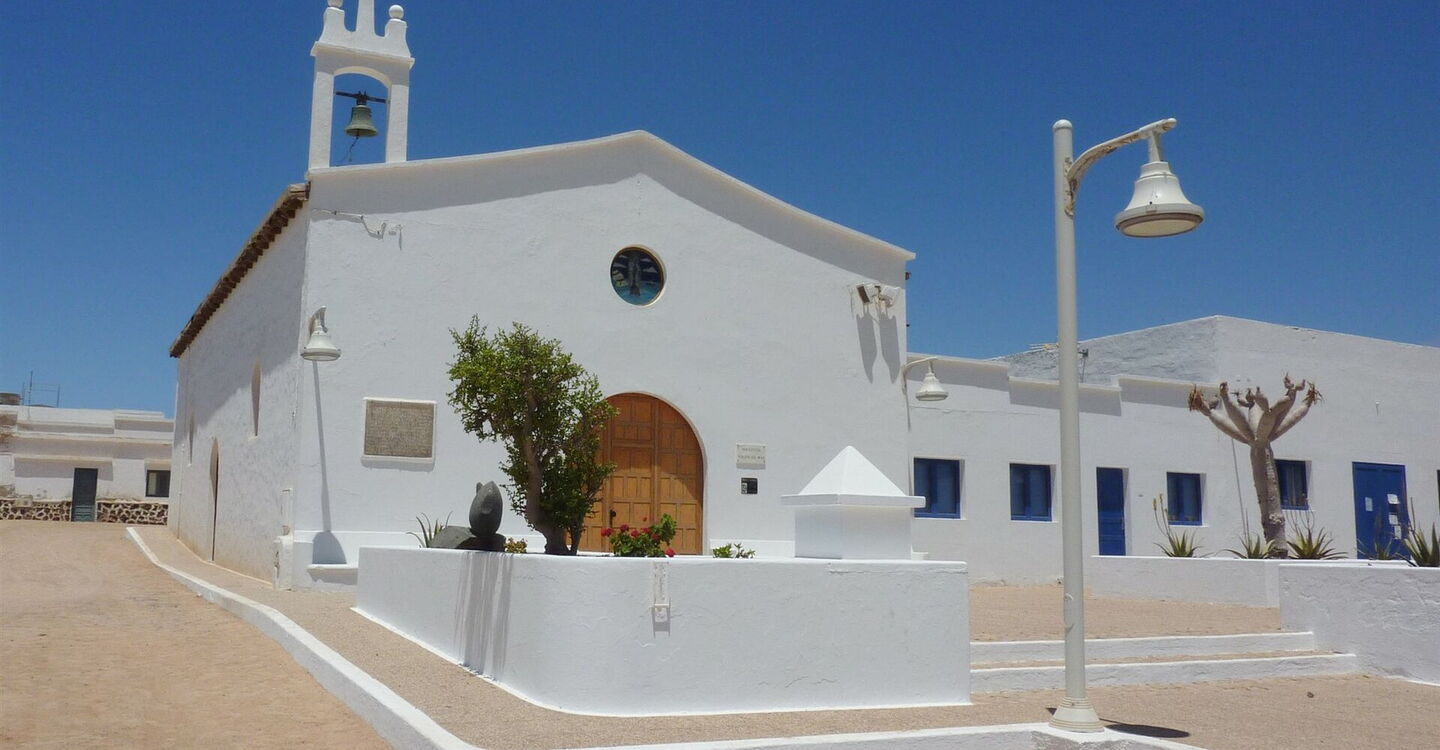 Bei der folgenden Weggabelung führt der Weg rechts an dem mittig stehenden Haus vorbei. Wir gehen direkt auf die schlicht gehaltene weiße Dorfkirche 02 La Virgen del Mar 3 m mit ihrem minimalistischen Glockenturm zu. Im Inneren der Kirche gibt es eine Besonderheit, ein Taufbecken aus einem Schildkrötenpanzer. Weiter führt unser Weg rechts vorbei an der Kirche, um dann gleich links in die nächste Sandpiste abzubiegen. Hinter dem Kinderspielplatz gehen wir rechts, bevor wir dann gleich wieder links in die nächste Straße abbiegen. An einer Wegkreuzung gehen wir halb links auf den mit vereinzelten Sandhaufen gesperrten Weg, bis wir auf den Hauptweg treffen, auf dem der Richtung Norden weiter wandern.