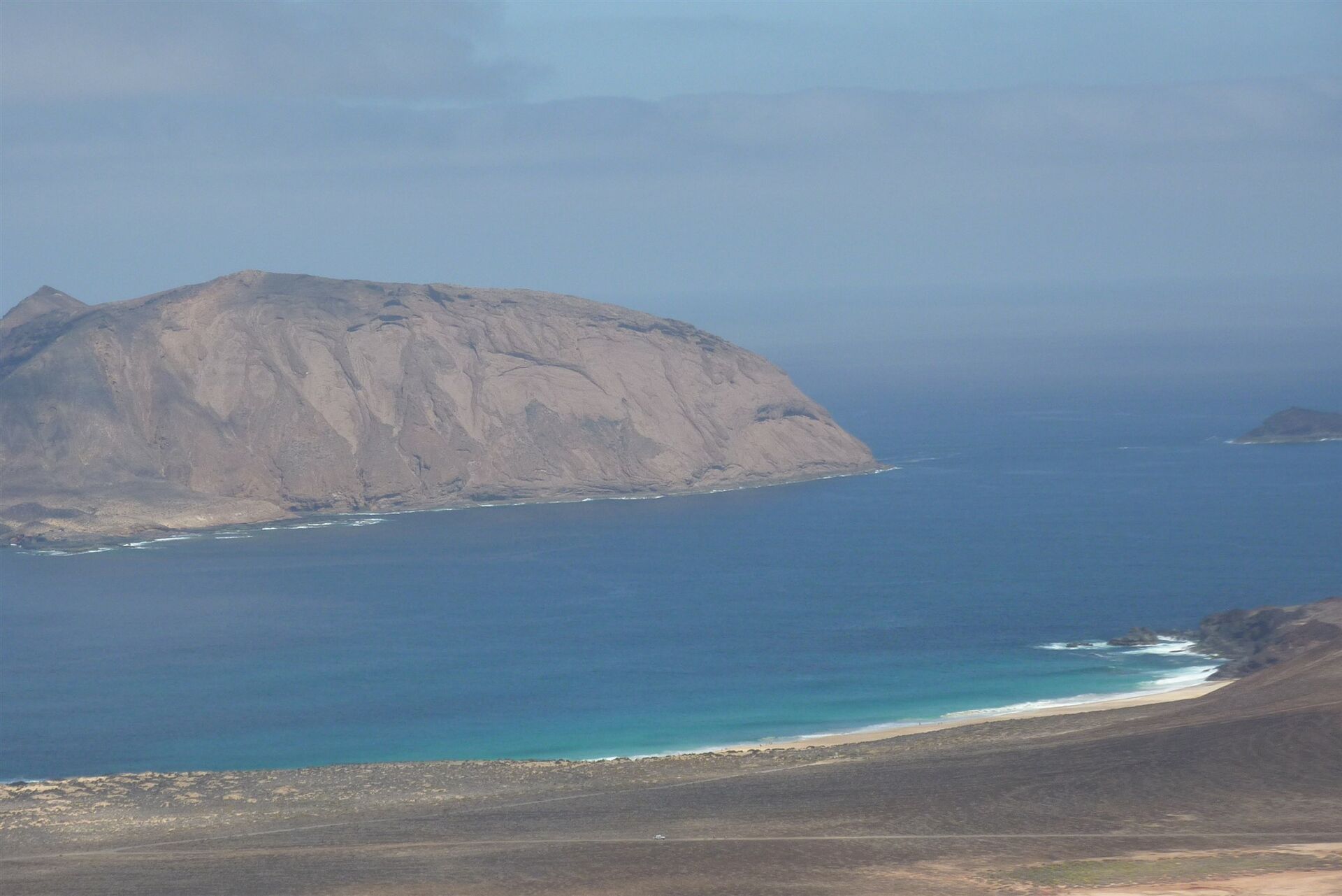 Wir gehen jetzt genau auf die Einzelsattelung der beiden vor uns liegenden Vulkane zu. Bei dem linken Vulkan handelt es sich um die Montaña del Mojon und der rechte Gipfel ist der Agujas Grandes, mit 266 m die höchste Erhebung auf der Insel. Nach insgesamt 2 km Wegstrecke (vom Hafen gemessen) erreichen wir eine 03 Kreuzung im Nichts 62 m. Die Sandpiste rechter Hand führt zu dem kleinen Fischerdörfchen Pedro Barba und halb links führt die Piste zur Punta del Pobre im Süden der Insel.