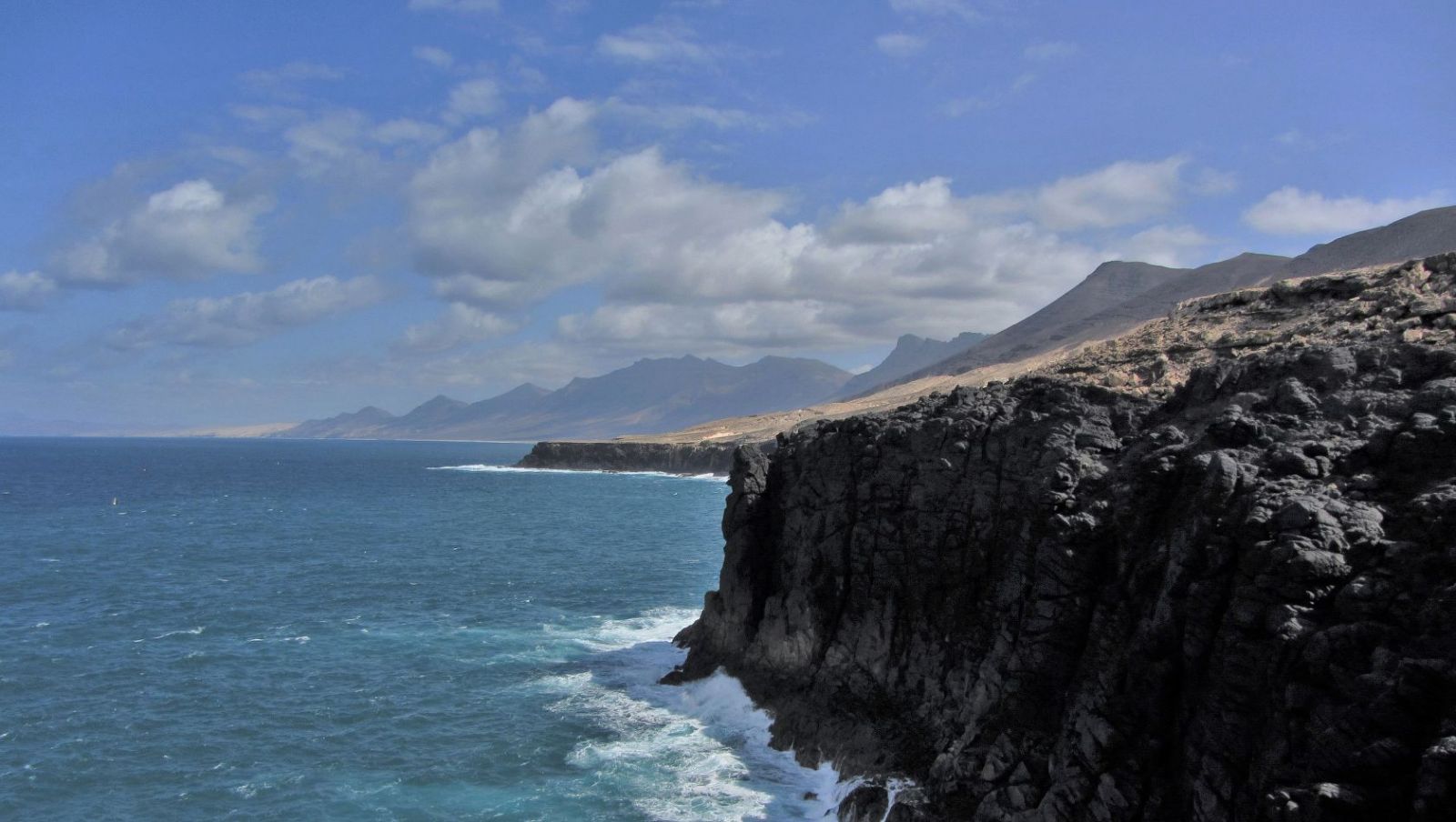 Geht man weitere 300 m nach rechts, so erreicht man einen wunderschönen (03) Aussichtspunkt (49 m). Schwarze Vulkansteinklippen treffen hier auf den azurblauen Atlantischen Ozean. Bei klarem Wetter hat man von hier aus eine beeindruckende Sicht auf die Strände Playa de Cofete und Playa de Barlovento sowie entlang der Bergkette der Halbinsel Jandia.