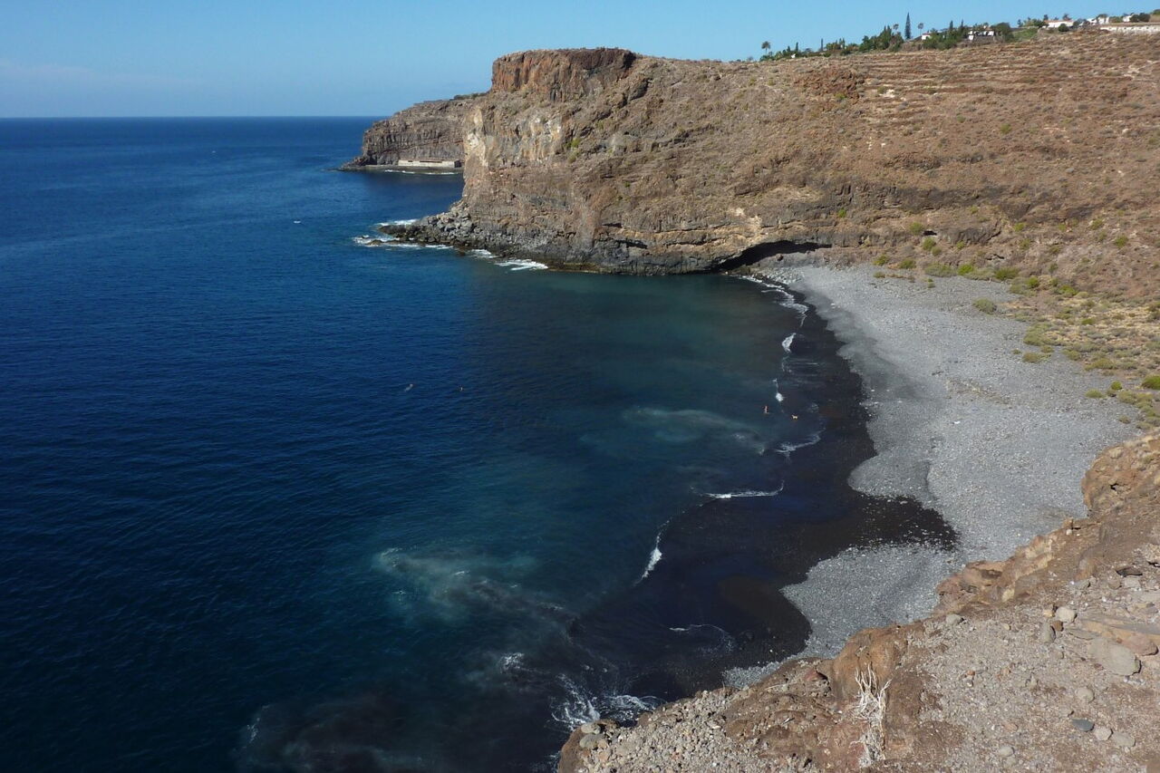 Am (01) Playa del Medio (5 m) verlässt am linken hinteren Ende des Parkplatzes ein steil aufsteigender Pfad die Bucht in östliche Richtung. Wir überschreiten die Punta del Joradillo und nach einem kurzen Abstieg erreichen wir den Playa de Chiriguarime. An seinem westlichen Ende gibt es einige sandige Stellen. Wir queren den Strand zu seinem östlichen Ende und gehen direkt auf eine kleine Ruine zu. Hinter dieser beginnt ein steil aufsteigender Pfad, der durch vereinzelte hellblaue Punkte markiert wurde. Auf dem Bergrücken angekommen, wandern wir kurzfristig auf dem oberen von zwei Küstenpfaden, orientieren uns dann aber im weiteren Verlauf an Steinmännchen.