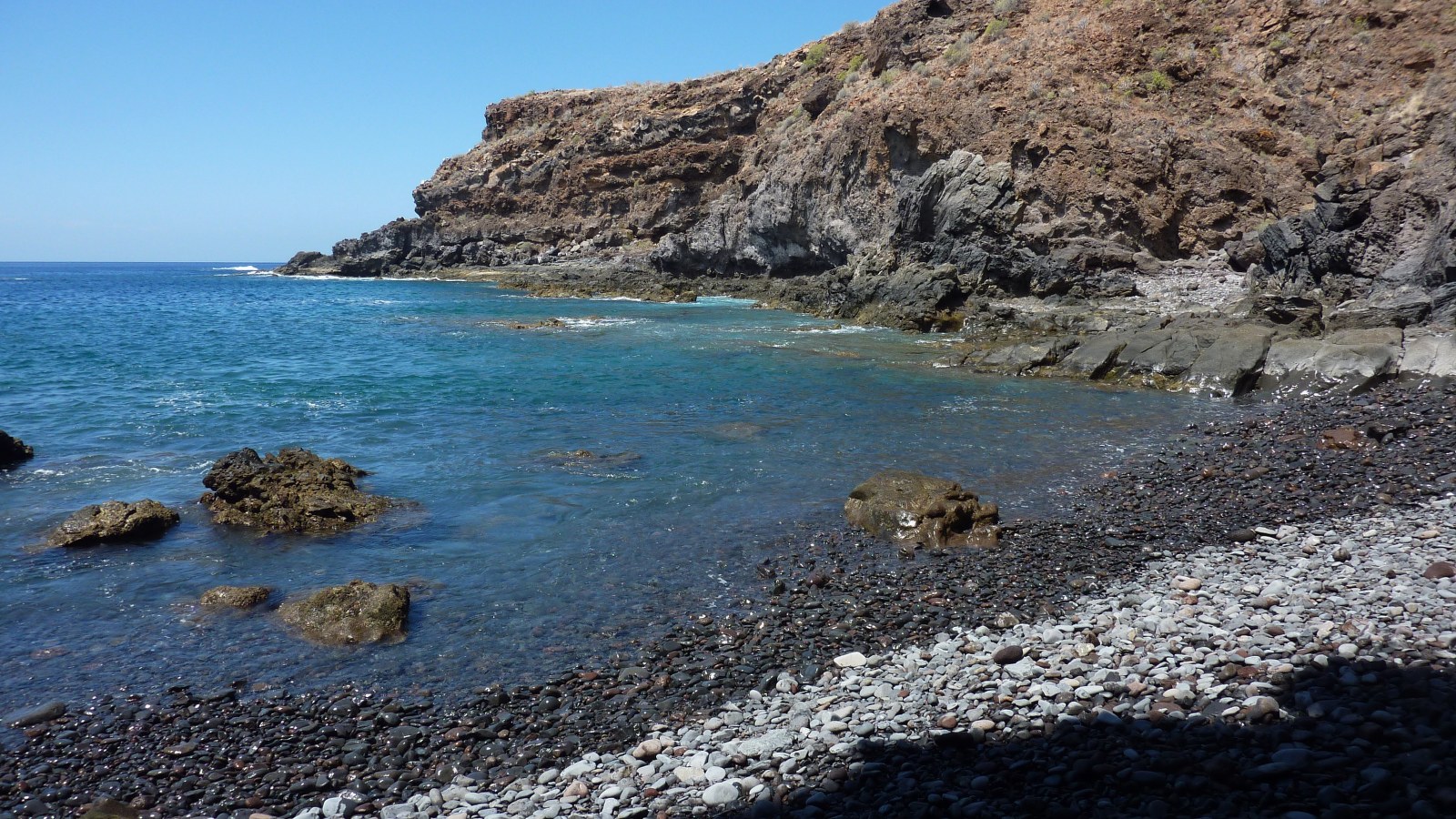Es wird ein kleines Barranco gequert, bis wir ca. 100 Höhenmeter über dem (02) Playa de Suarez (21 m) stehen. Steinmännchen markieren den Abstieg in die Bucht. Immer wieder muss auf rutschigem Untergrund der Hang gequert werden, weil der ursprüngliche Weg abgerutscht ist. Wir gehen weiter, bis wir die 130 Meter breite Bucht erreicht haben. Leider gibt es hier keine sandigen Stellen und die großen Kieselsteine laden nicht zum Verweilen ein. Taleinwärts, hinter der Steinplattform mit dem grünen Teppichrasen, steigen wir halb rechts im Hang auf und folgen dabei Steinmännchen, bis wir vor einer ca. 5 m hohen Felswand stehen. Links neben einer kleinen Höhle befindet sich der Aufstieg - Kletterstelle mit dem Schwierigkeitsgrad zwei - zu einem Steinmännchen hinauf.