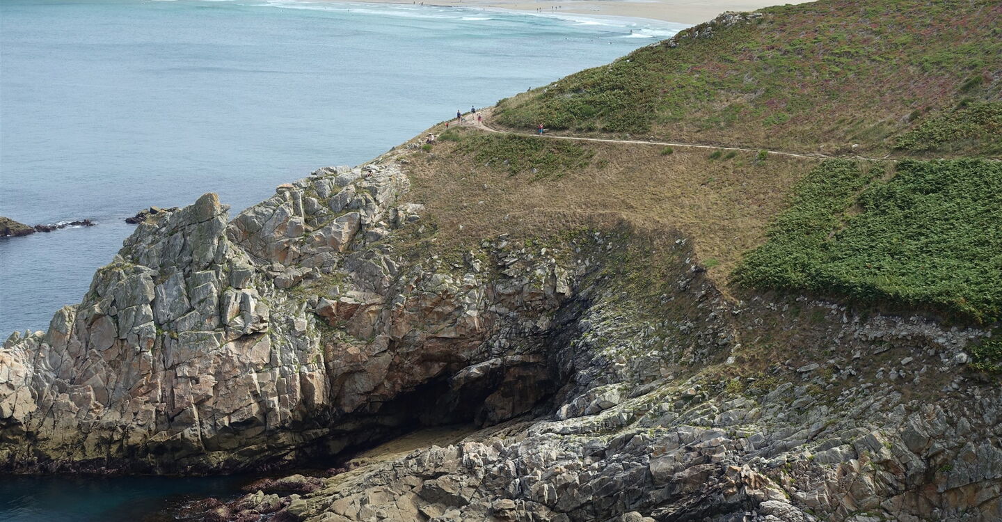 Bei der Landspitze 04 Pointe du Raz (63 m) ist das Panorama unvergleichlich: Man schaut über das aufgrund der kräftigen Gezeitenströmungen und oft hohen Wellen quirlige Gewässer des Raz de Sein bis zur Isle of Sein. Dazwischen befinden sich die Leuchttürme Phare de la Vieille – direkt der Küste vorgelagert – und Phare de Tévenne – halb rechts in 5 km Entfernung. Hinter der 7 km entfernten Insel Sein erhebt sich der berühmte Leuchtturm Ar Men am Horizont, der bekannteste und am weitesten von der Küste entfernte Leuchtturm Frankreichs. Er markiert die Einfahrt der Sein-Passage.