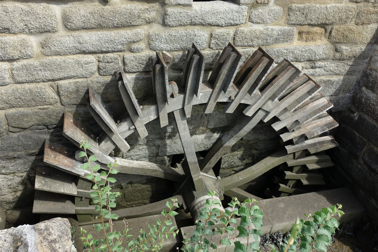 Wir queren die Straße und gehen auf dem parallel verlaufenden Pfad weiter, kurz später dann auf der Straße. Bald erreichen wir die Gezeitenmühle 02 Moulin A Mer Hénan (7 m). Hinter dem ehemaligen Haus des Müllers biegen wir links ab, gehen über den Parkplatz und gelangen hinter der Informationstafel wieder an das Flussufer. Bei zwei hölzernen Wegweisern führt rechts ein Weg zu der versteckt im Wald liegenden Chapelle Sainte-Marguerite, die wie viele bretonische Sakralbauten aus Granit besteht.
