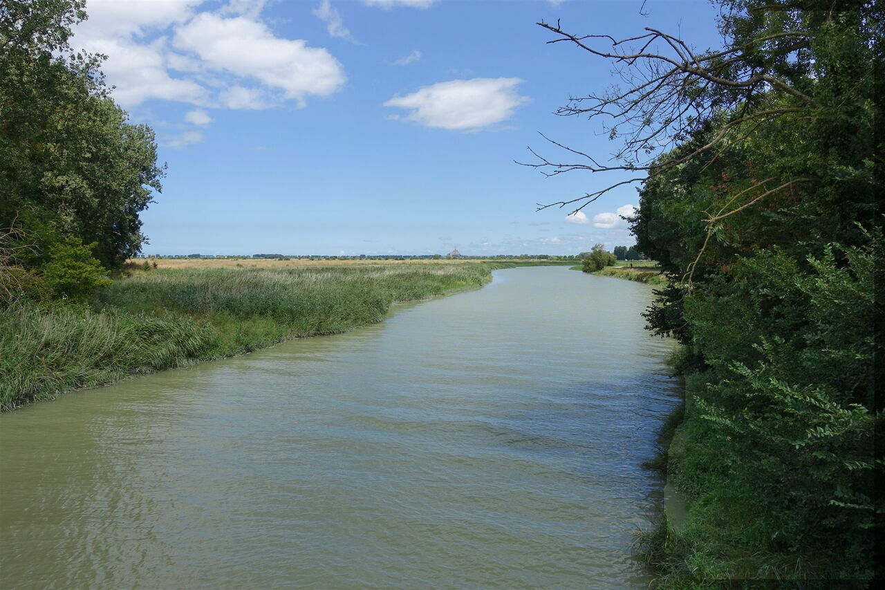 Bei dem ersten Kreisverkehr mit dem Springbrunnen gehen wir fortan auf der rechten Uferseite des Flusslaufes des Couesnon, auch ausgeschildert Richtung Le Mont-Saint-Michel. Es geht durch einen angelegten Garten mit exotischen Bäumen und vorbei an prachtvollen Villen. Die Wegführung ist immer eindeutig. Im weiteren Verlauf unterqueren wir die Bundesstraße und gelangen zur 02 ersten Brücke (1 m). In der Ferne kann man bereits die Kirchturmspitze der Abtei sehen.