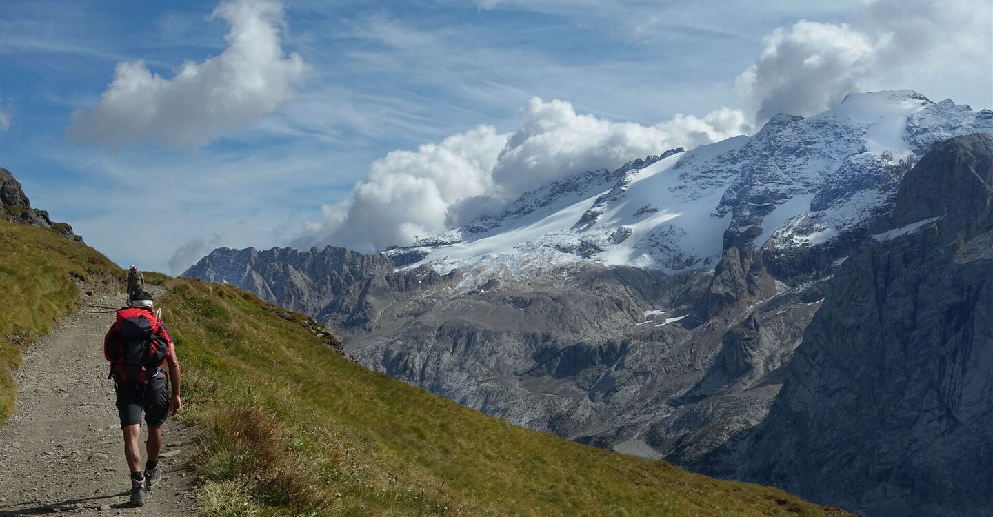 Heute heißt es entspannen und die prachtvolle Aussicht auf die Marmolata genießen. Wir wandern auf dem sogenannten Bindelweg vom Pordoijoch zum Lago Fedaia. Dieser war schon in der Vergangenheit ein wichtiger Verbindungsweg und wurde von Mehlhändlern aus der Provinz Belluno genutzt. Dadurch war es möglich, regen Handel zu betreiben. Mehl wurde gegen handgefertigte Produkte aus der Provinz Trentino getauscht. Auch erhielt die Hütte am Wegpunkt 03 den Namen Weg des Brotes, d. h. übersetzt ins Italienische Viel dal Pan. Wiederentdeckt wurde der Weg von dem Deutschen Dr. Karl Bindel, deswegen heißt er auch Bindelweg.