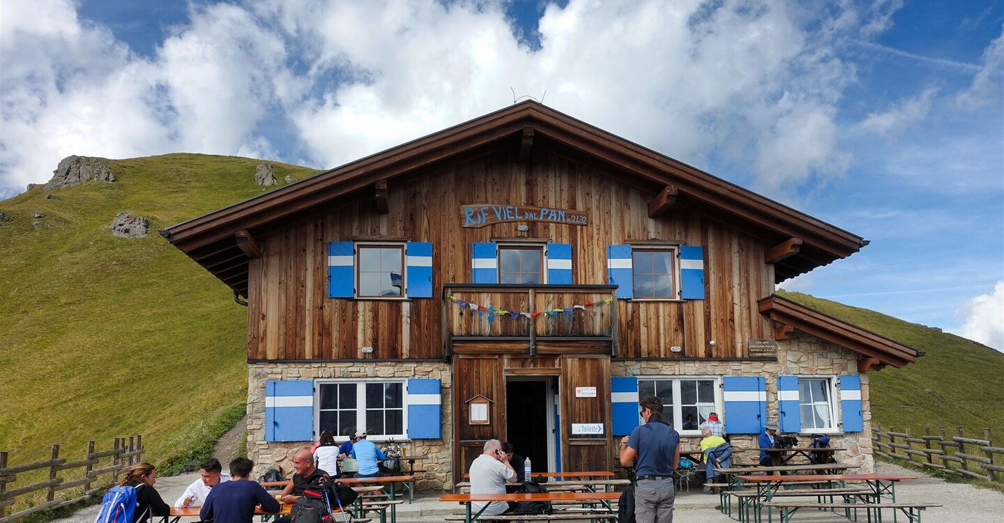 Es folgt ein aussichtsreicher Höhenweg mit faszinierender Fernsicht auf das Bergmassiv der Marmolata. Auf halber Strecke der heutigen Etappe erreichen wir die nächste Hütte, das 03 Rifugio Viél dal Pan (2.432 m).