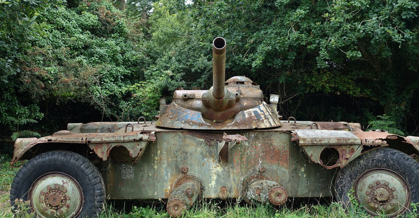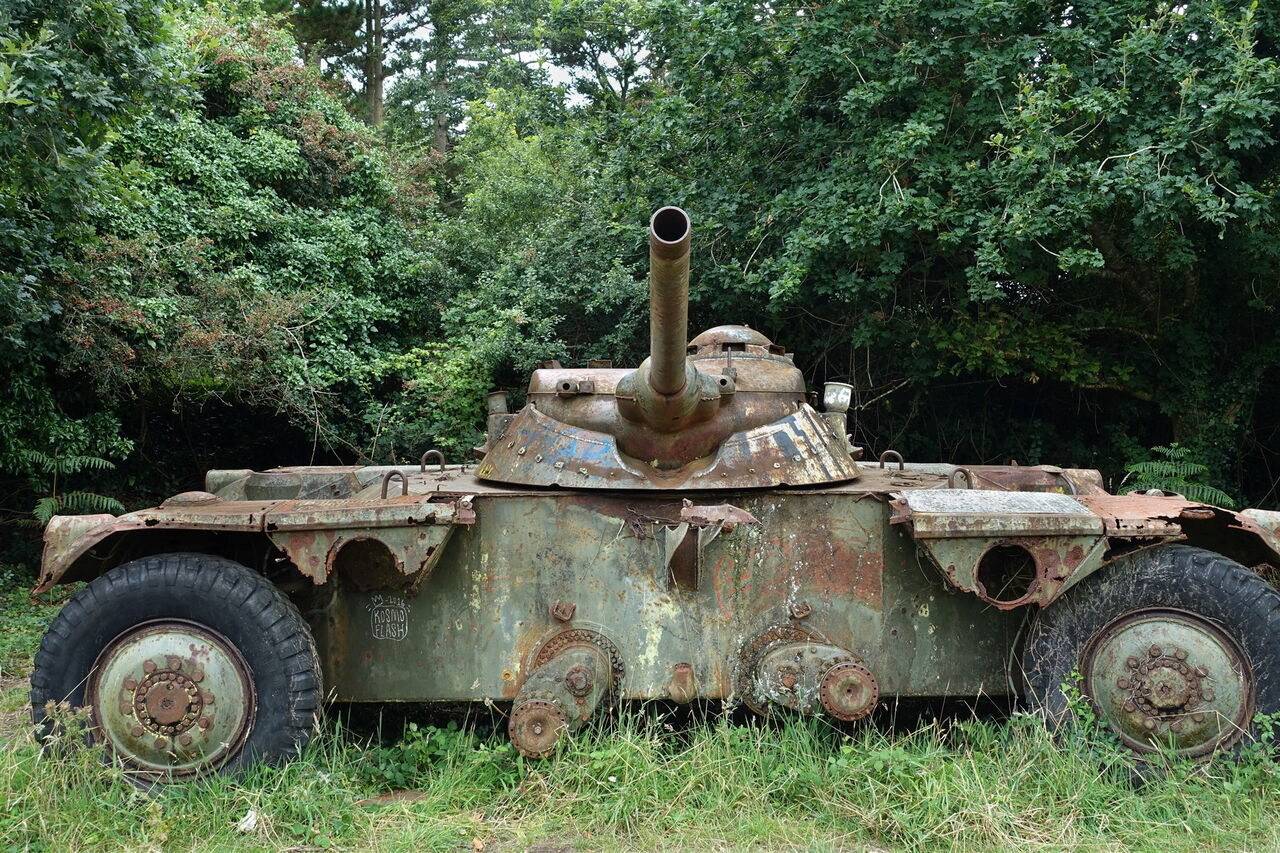 Es folgt ein langes Wegstück. Anschließend gehen wir wenige Meter auf der Straße und dann sofort links. Wir kommen an weiteren Stellungen vorbei. Pfade führen herunter zum 04 Fort de Robert (66 m), einem Teil einer Artilleriestellung, die Brest seit dem späten 17. Jahrhundert verteidigte. Nicht in die Epoche passt der leichte Panzerwagen aus dem Zweiten Weltkrieg, der am Wegesrand seine Ruhe gefunden hat. Wieder an der Straße angekommen, gehen wir links auf dem breiten Weg weiter. In einer Senke überqueren wir zwei Holzbrücken. Nach kurzem Aufstieg führt ein Weg nach halb rechts, während wir hier halb links auf den Pfad mit dem Holzpfeiler abzweigen.