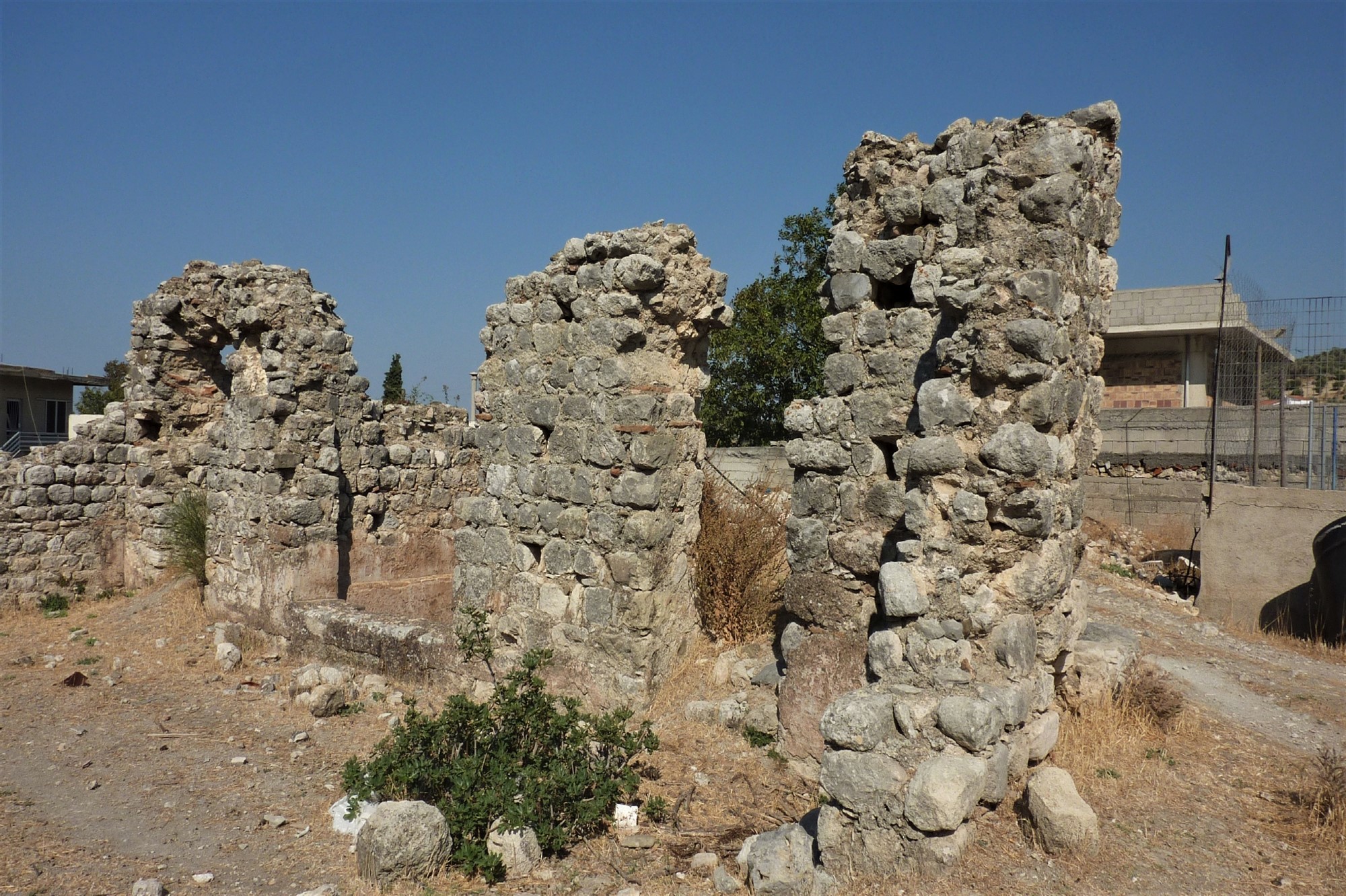 An dieser 02 Schlüsselstelle (136 m) gehen wir links am Reservoir und Schilfgras vorbei, dann im Bachbett 10 m rechts, um an geeigneter Stelle den Bach auf die andere Uferseite zu verlassen. Zwischen den Weinstöcken führt ein Wirtschaftsweg bergauf, den wir begehen, bis dieser endet und wir rechts an einem weiteren Wasserreservoir vorbeikommen. Wir ignorieren 3 rechte Abzweiger und gehen durch eine Links- und eine Rechtskehre, nun direkt auf die Kirche des Dorfes Kiparissos zu. Auf der Asphaltstraße verlassen wir das Dorf in Richtung Westen und der Ortschaft Pirgos, wo wir bei den Ruinen rechts hinunter einen Abkürzer zur unterhalb liegenden Asphaltstraße nehmen.