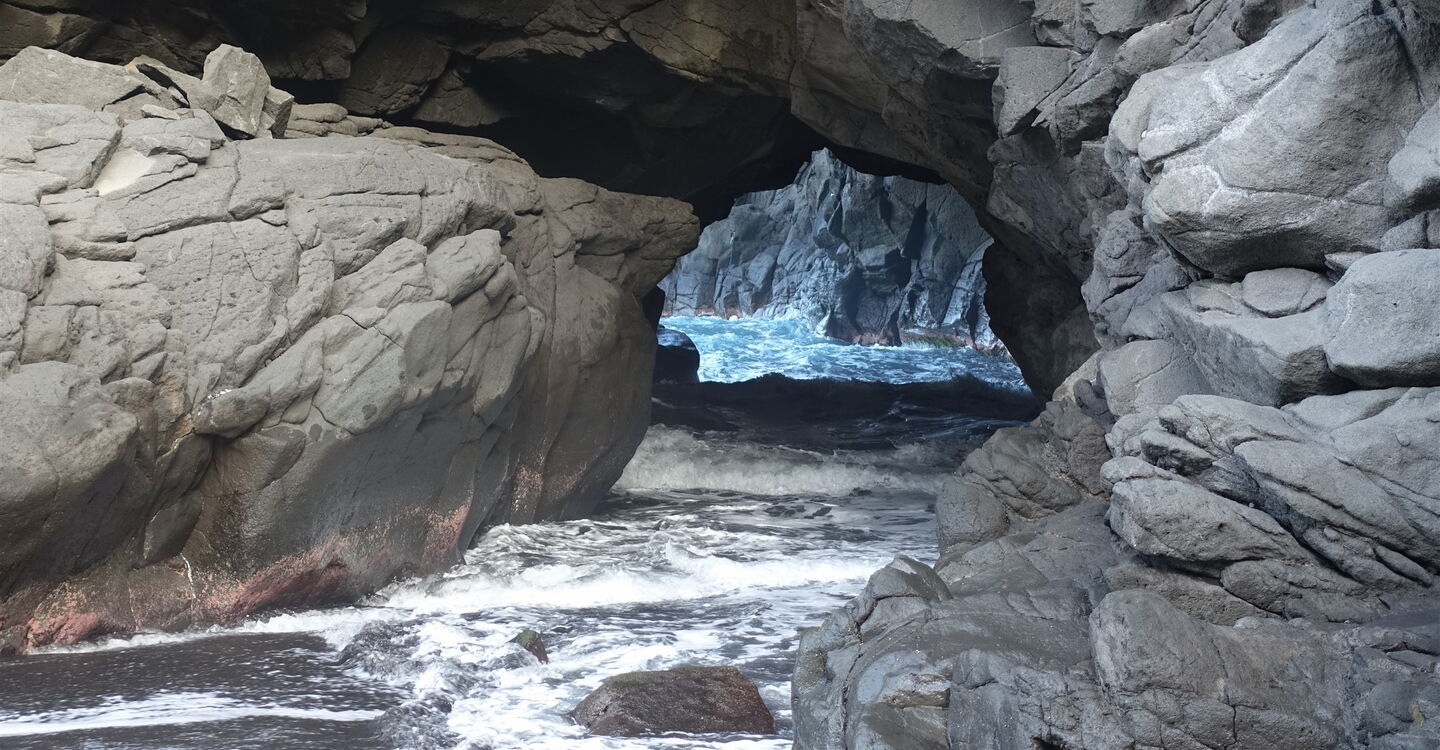 Dort, wo sich die Wasserläufe zweier riesiger Trockenflüsse zu einem Strom vereinen und sich dann durch ein 7 m schmales Nadelöhr aus mächtigen Granitfelsen zwängen, entdecken wir einen versteckten Traumstrand. Jahrtausende wurden Sedimente durch den Schluchtauslauf mitgeführt, es bildete sich dieser 500 m lange und 50-100 m breite, schwarzsandige Strandabschnitt. Sehr sehenswert ist ein Felsdurchbruch, durch den Wellen auf den Strand zurollen.