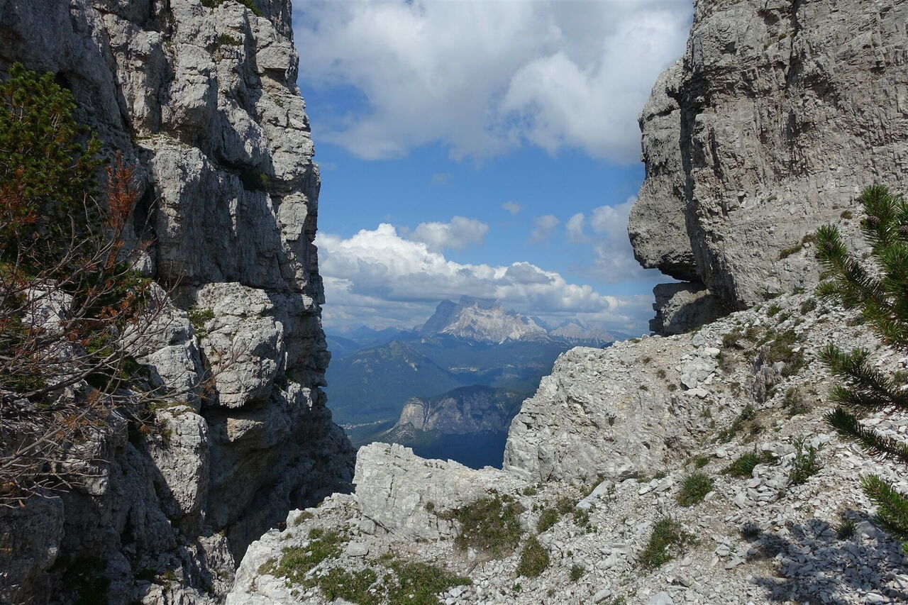In engen Kehren geht es ca. 250 Entfernungsmeter bergab bis zu einer Schlüsselstelle! Hier verlassen wir nämlich das weite Tal nach halb rechts und gehen unter Zuhilfenahme der Hände durch eine felsige Rinne bergauf! Außerdem befindet sich an dieser Stelle eine weiß-rote Markierung auf einem Stein, die aber nicht unbedingt ohne Weiteres zu sehen ist. Über einen schmalen, mit Gras und Latschenkiefern bewachsenen Kamm gehen wir anschließend ein längeres Stück und erreichen auf der rechten Bergseite die 03 Forcella del Viaz de le Ponte (1.885 m). Der nun sehr steile und geröllige Abstieg durch die Scharte ist zusätzlich mit Metallseilen gesichert. Wer nicht trittsicher und schwindelfrei ist, sollte vorsichtshalber das Klettersteigset anlegen.
