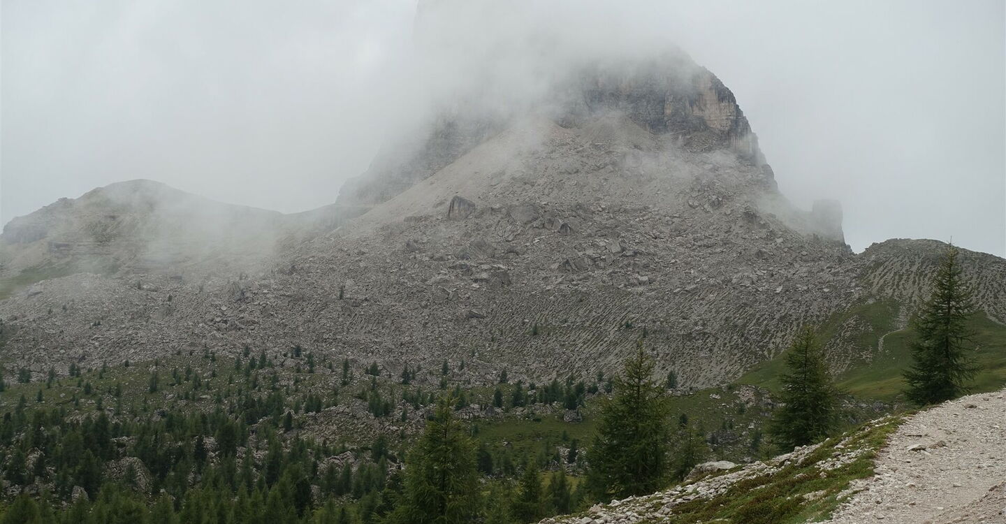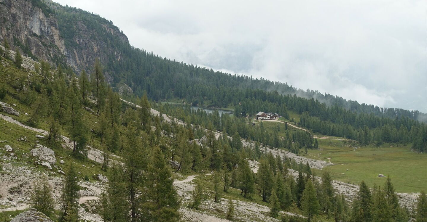 Durch den lichten Wald – unterhalb der Westhänge des Berges Col de la Puina – wandern wir auf der Forststraße leicht bergab. Sobald wir unterhalb der Forststraße das 05 Rifugio Città di Fiume (1.918 m) sehen, steigen wir auf dem nachfolgenden Pfad zum Haus ab. Von der Hütte blickt man direkt auf die mächtigen Schutthalden der Nordwestflanke des 3.127 m hohen Monte Pelmo.