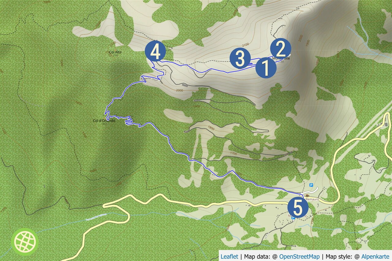 Ohne Anstieg geht es auf Pfaden und Schotterstraßen nur bergab. Art des Weges: 40 % Schotterstraße und 60 % Pfad. Zusatzausrüstung: keine. Einkehr: km 1,0 Rifugio Dolomites. Beste Wanderzeit: Ende Juni bis Anfang Oktober.