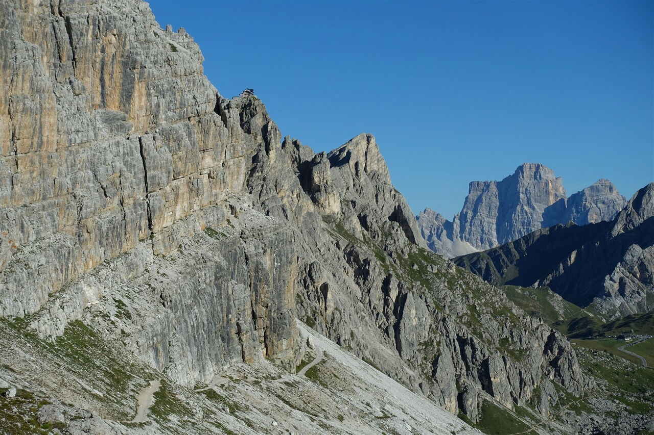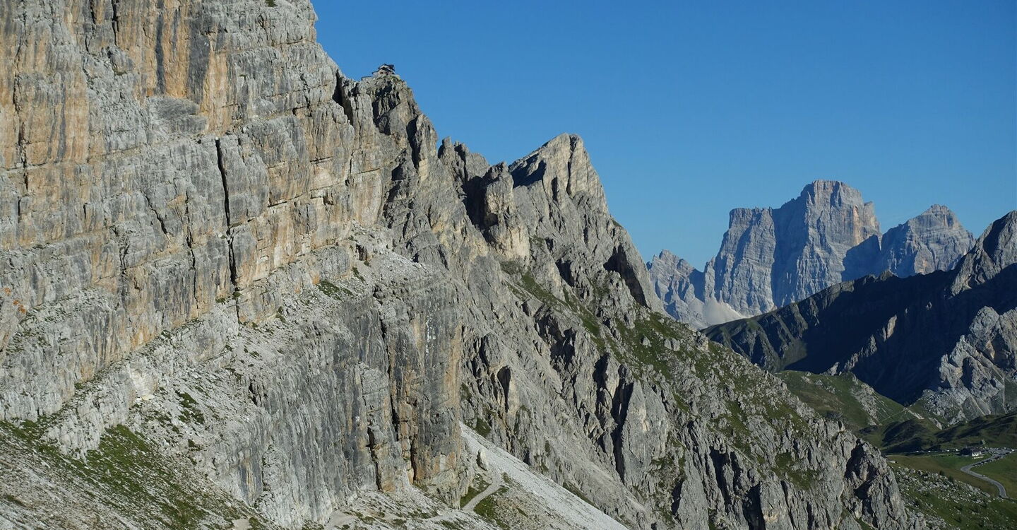 Nach prachtvollen Ausblicken auf die senkrecht abfallenden Felswände der Tofana di Rozes verlassen wir die wundervolle Stille der Berge und tauchen ein in den Massentourismus am Falzarego-Pass, welcher den Übergang von der Fanesgruppe in die Ampezzaner Dolomiten markiert. Nach wenigen Metern auf dem Wanderweg hat uns aber die Stille der Berge wieder, wir wandern auf die allein stehende Felsspitze des 2.647 m hohen Gipfels des Berges Monte Averau (siehe Tour 25) zu – einem der schönsten Aussichtsgipfel der Dolomiten. Sobald wir uns auf einem Schotterband unterhalb der steil abfallenden Südwände des Monte Averau befinden, kann man bereits das heutige Etappenziel, das Rifugio Nuvolau, auf einer Felsspitze erspähen. Auch präsentiert sich der Monte Pelmo sehr fotogen. Der Gipfel des Monte Nuvolau ist eine 360°-Aussichtsplattform par excellence.